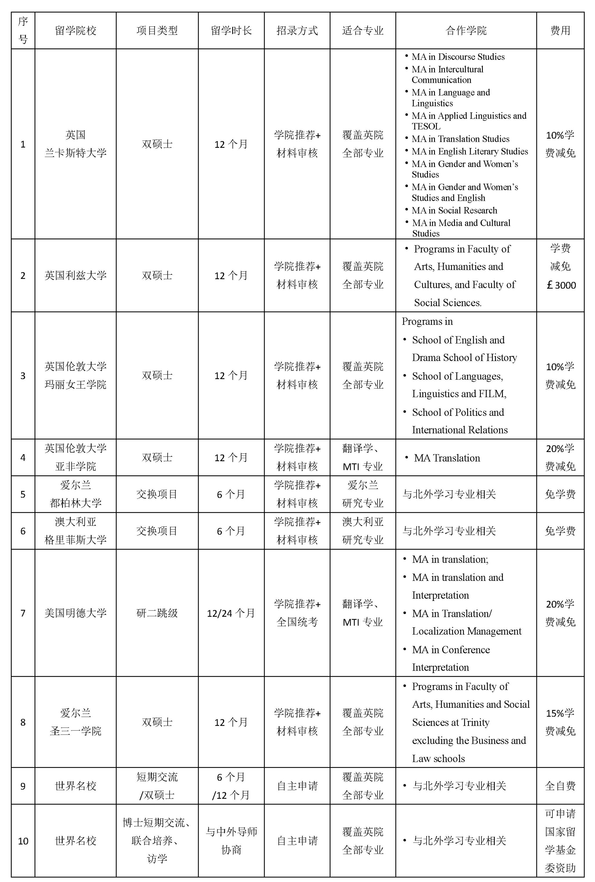 海角视频 研究生(含硕士生和博士生)短期留学项目旨在培养国际化复合型人才,为学生提供赴世界名校交流学习的机会。硕士生出境交流时间须在完成一年学习之后根据具体情况确定,博士生须与导师商量后确定。短期留学项目注重夯实学生专业功底,提升学生的专业素养、跨学科能力及国际竞争力,助力学生全面发展。学生在外就读专业与北外在读专业相关,所修学分得到认可,可计入毕业学分。各项目简要介绍请参见下表。