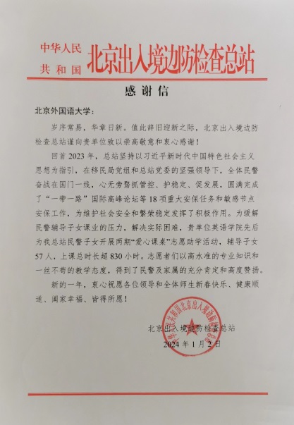 (北京出入境边检总站寄来的感谢信)