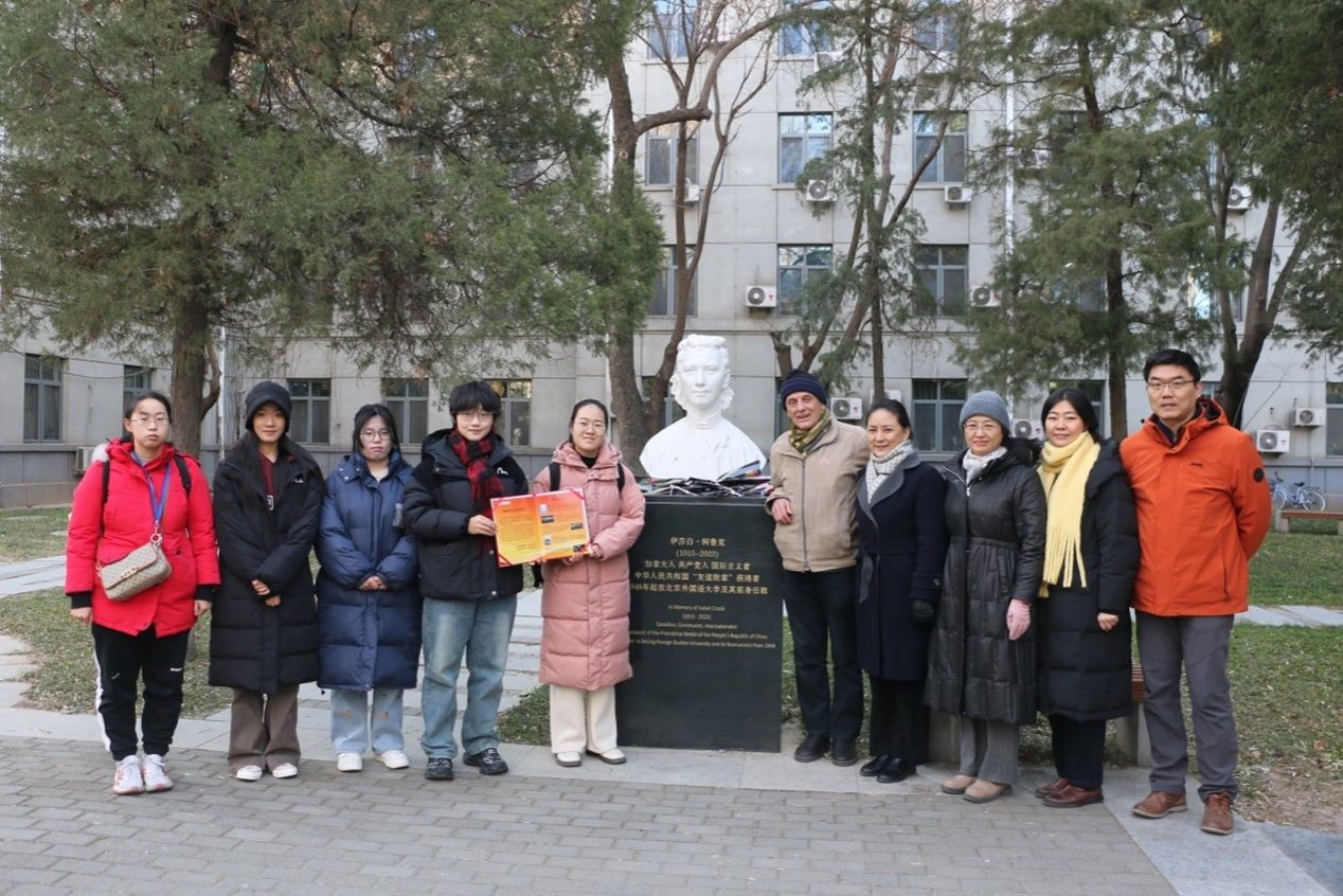 师生一行前往柯鲁克夫妇雕塑前敬献鲜花,向柯鲁克夫妇及其子女表达感谢,并送上学生们制作的感谢卡片。柯鲁克夫妇毕生致力新中国外语教育事业,传道受业解惑,一生桃李芬芳。1996年,伊莎白·柯鲁克向海角视频