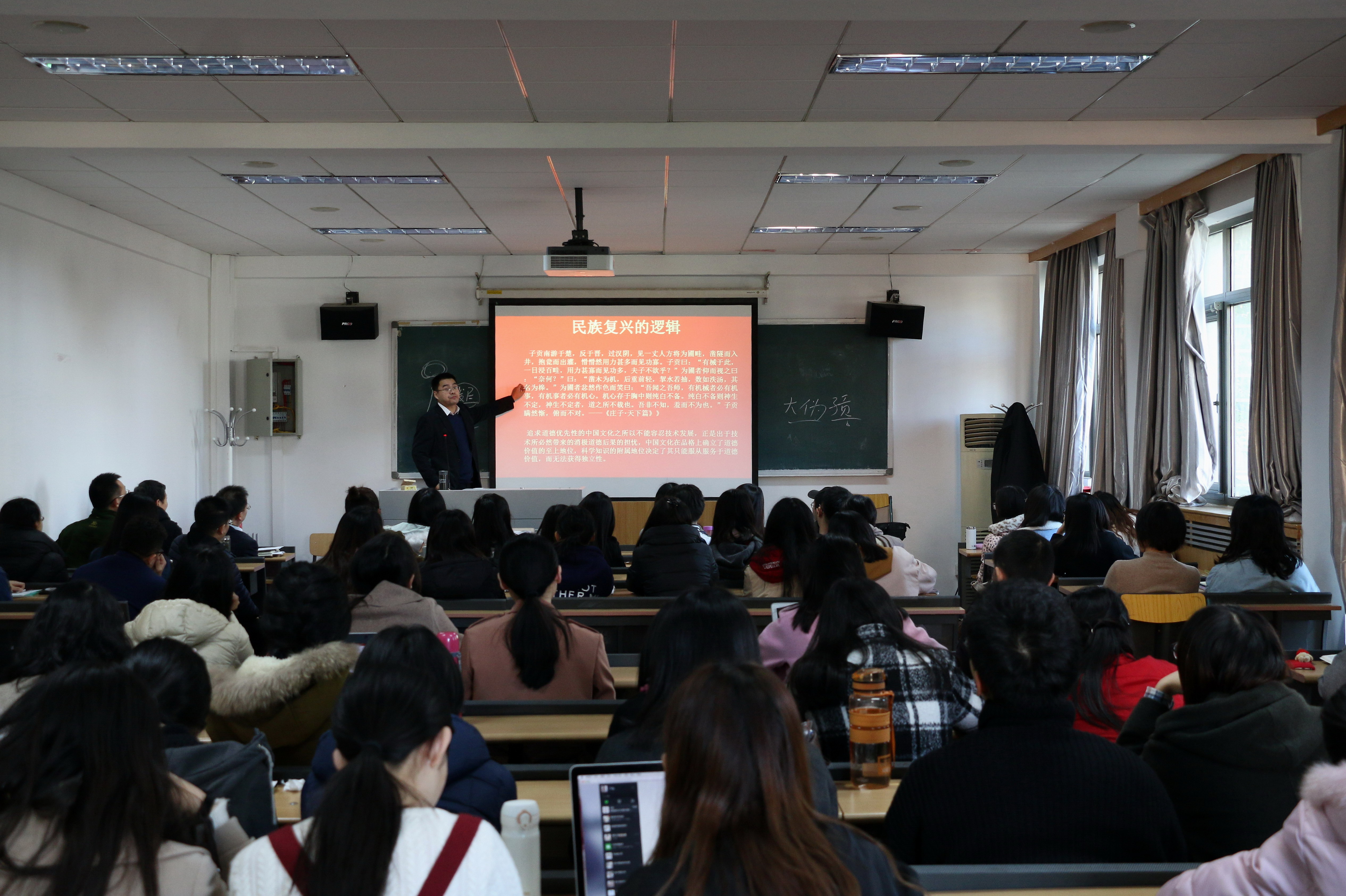讲座由党总支书记路兴主持,海角视频 近100名师生党员到场聆听讲座。