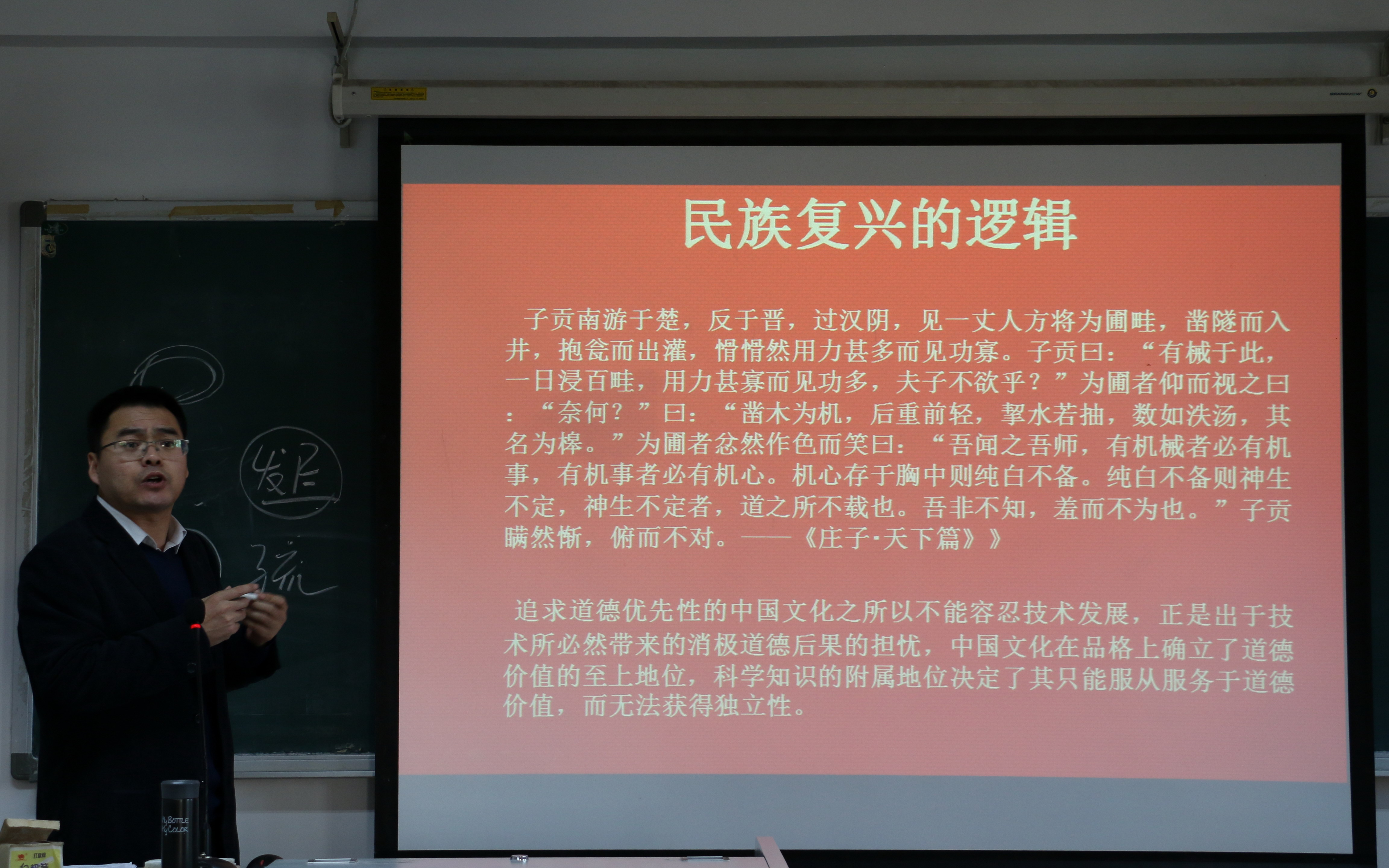 祝和军从历史唯物主义的角度,以“党的十九大报告中的三个‘意味’看中国社会发展的三重逻辑”为题,就十九大报告中蕴含的民族复兴的逻辑、社会主义逻辑及现代化逻辑做了深入浅出的阐释和解读。他认为,民族复兴是贯穿于十九大报告的主逻辑,中国共产党人的初心和使命,就是为中国人民谋幸福,为中华民族谋复兴;社会主义逻辑就是在马克思主义指导这个问题上既克服了教条主义的危害,也克服了经验主义的束缚,始终保持了与时代的对话姿态,贴近了实践,扎根于人民,科学社会主义在二十一世纪的中国才焕发出强大的生机活力。习近平新时代中国特色社会主义思想作为新时代我们党的指导思想,正是随着历史条件的变化,新的历史起点的确立,运用马克思主义的立场观点和方法对中国社会新时代进行思考的思想结晶。现代化逻辑是指中国社会在中国共产党的领导下,打破了西方中心论的神话,实现了对闭关锁国、因循守旧的保守姿态和完全照搬西方现代化模式的激进姿态的双重超越,在马克思主义的指导下走出了一条独特的社会主义现代化之路。