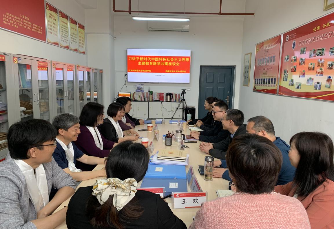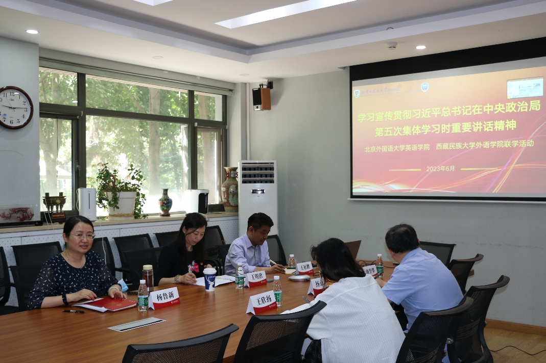 党总支书记王明欣、副书记孟庆琨,副院长王展鹏、彭萍、杨鲁新,党总支委员、教工党支部书记;西藏民族大学外语学院党委书记刘怡春,院长赵家红、副院长郭彧斌,教师党支部书记以及两校部分教职工代表以两地线上线下共同进行的方式开展联学。