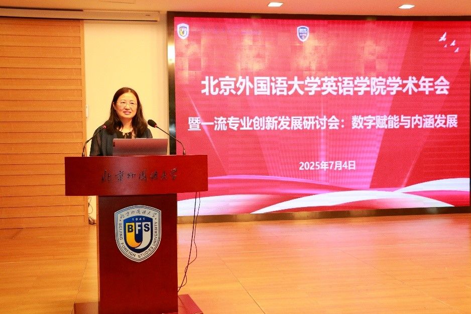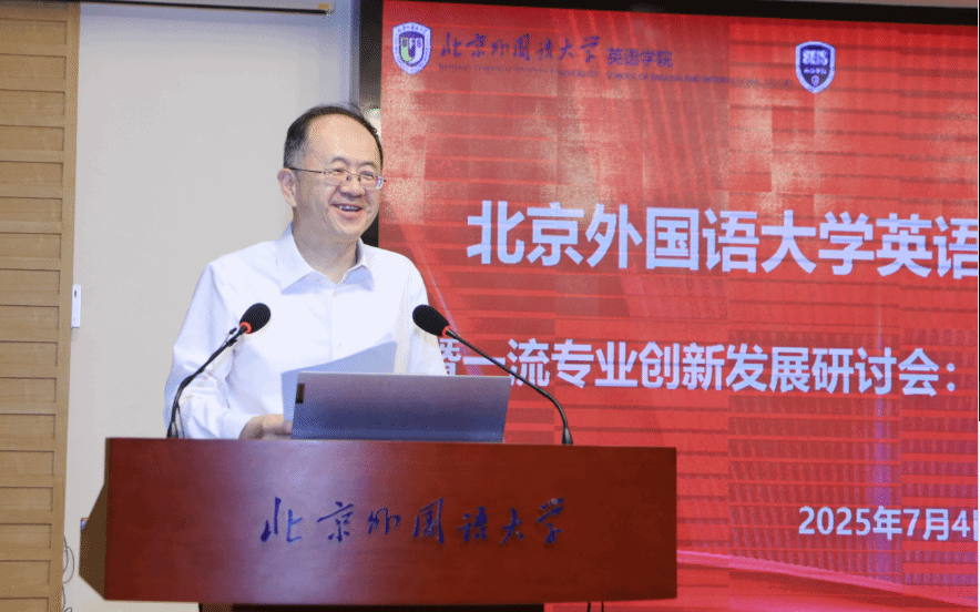 校长贾文键教授致辞,对AI时代英语专业的发展与未来作出深刻阐述。他认为,AI技术的迅速发展给传统外语教学带来挑战,教师应主动拥抱技术,有效使用AI助力外语教学和科研。贾文键指出,北外在2025年QS语言学排名跃居全球第18位,海角视频
