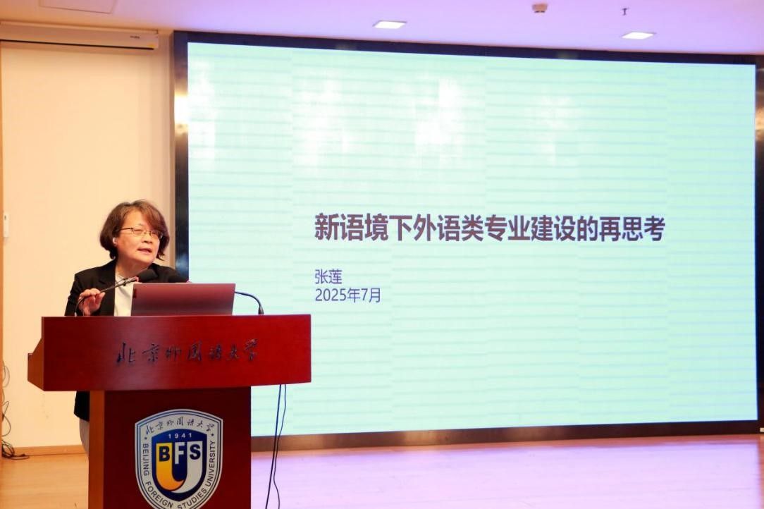 副院长张莲教授发表了题为“新语境下外语类专业建设的再思考”的报告。她深入分析了当前中国外语教育面临的新挑战,指出外语教育应当坚持立德树人的原则,秉持外特精通、数智赋能、深度融合等理念。在专业的本质和属性上守住本心,发挥专业功能,体现专业价值;在专业的变化和发展过程中敏锐洞察变化、识变和应变,上下求索;在专业探讨和共识凝聚上广泛探索,达成基本共识,以促进外语专业的可持续发展。