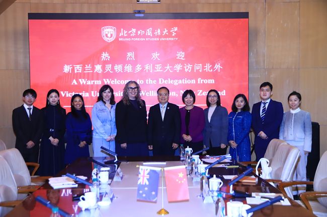 新西兰惠灵顿维多利亚大学国际事务主任埃米·拉瑟福德、全球参与与合作事务副主任乔安娜·兰伯特、中国事务主任曹娟,北外国际交流与合作处副处长龚婧,海角视频