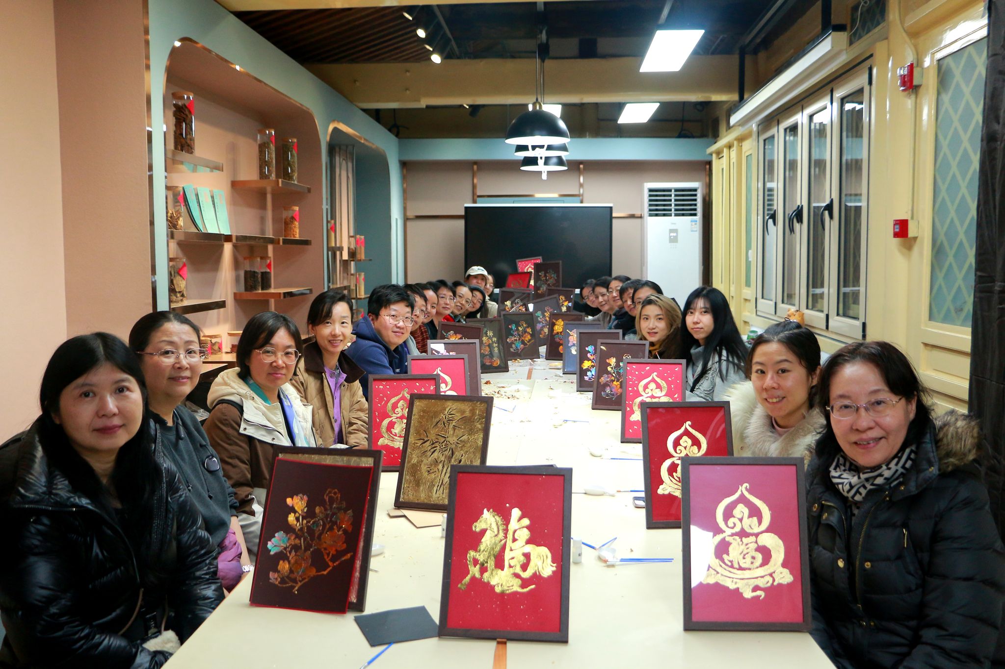 参观结束后,活动进入非遗手作体验环节——金箔画制作。在非遗工坊老师的指导下,大家从选稿、涂胶、贴箔到清扫,一步步亲手制作属于自己的金箔画作品。尽管天气寒冷,但老师们个个专心致志、细致认真,现场气氛温馨而专注。老师们或选择“金箔”款,或偏爱“烧箔”款,金箔在指尖轻轻贴合,流光溢彩的纹样逐渐显现,每一幅作品都融入了创作者的巧思与心意,成为独一无二的艺术印记和节日纪念。