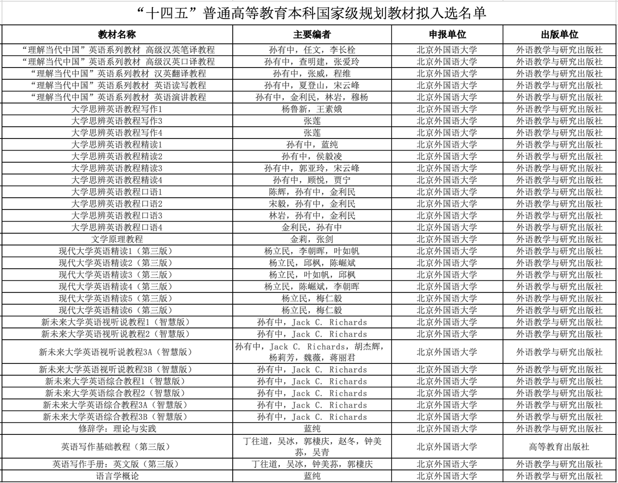 35册教材拟入选“十四五”普通高等教育本科国家级规划教材,其中包括孙有中教授等主编的《“理解当代中国”英语系列教材》,杨鲁新、张莲、孙有中教授等主编的《大学思辨英语教程》系列教材,杨立民教授等主编的《现代大学英语》系列教材,在学校各语种拟入选教材中名列前位。