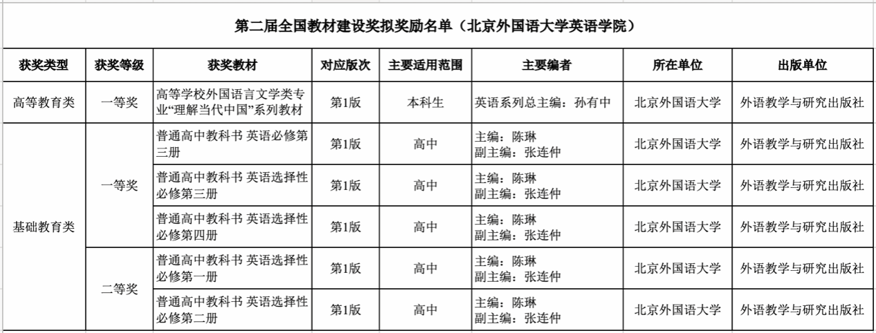 6部教材拟入选第二届全国教材建设奖。孙有中教授主编的《高等学校外国语言文学类专业“理解当代中国”系列教材》荣获高等教育类一等奖;陈琳教授主编的《普通高中教科书 英语必修第三册》等3部教材荣获基础教育类一等奖、《普通高中教科书 英语选择性必修第一册》等2部教材荣获基础教育类二等奖。