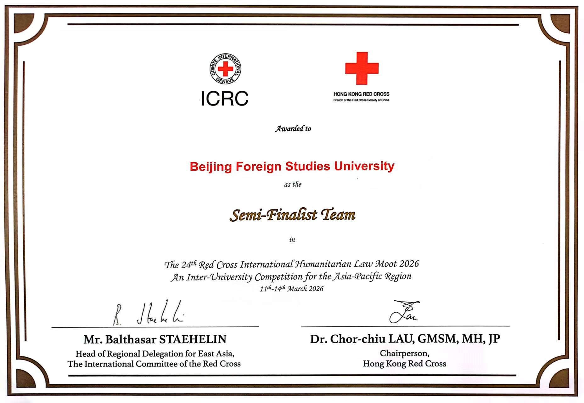 英语(中国政法大学联合培养涉外法治人才)专业2023级本科生邹一鸣与法学院4名同学组成的代表队,在法学院付姝菊老师、法学院2022级本科生邱嘉欣的指导下荣获亚太地区四强,创造了我校代表队参与红十字国际人道法模拟法庭竞赛的最好成绩。