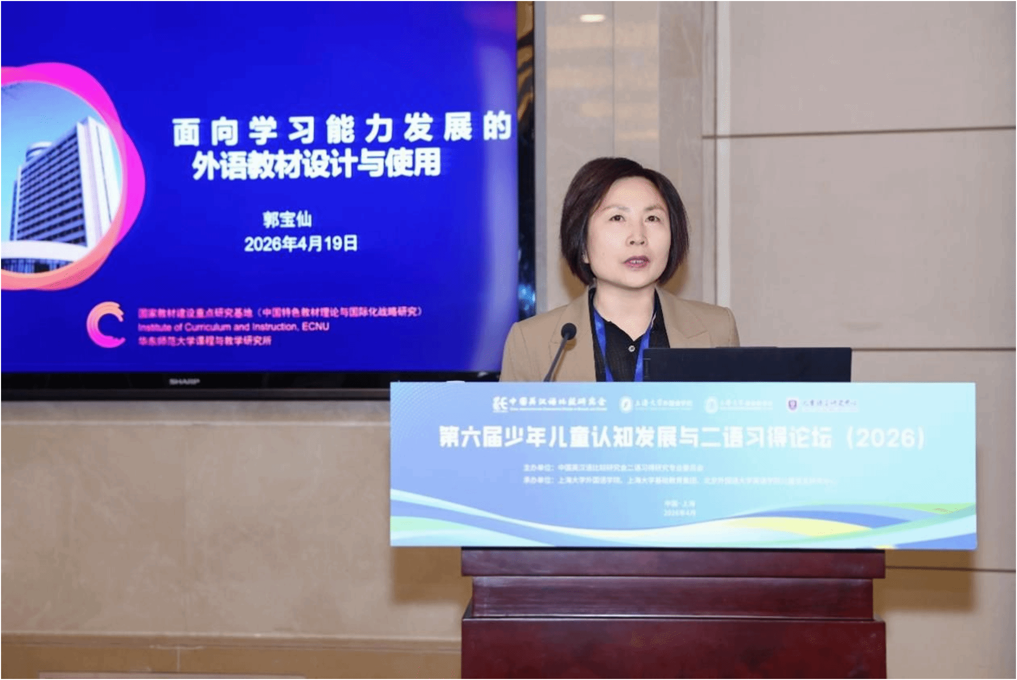 第五场主旨报告由上海大学外国语学院大学外语部副主任于梅欣副教授主持。华东师范大学郭宝仙教授以“面向学习能力发展的英语教材设计与教学转化”为题作主旨报告。郭教授指出,学习能力是当今世界普遍关注的核心素养目标,培养学生的学习能力已成为英语学科育人的重要目标,并对学习能力的内涵进行了深入界定,基于大量的教材设计实例系统阐述了英语教材设计的基本原则。最后,郭教授为一线教师提出了切实可行的教学转化建议。