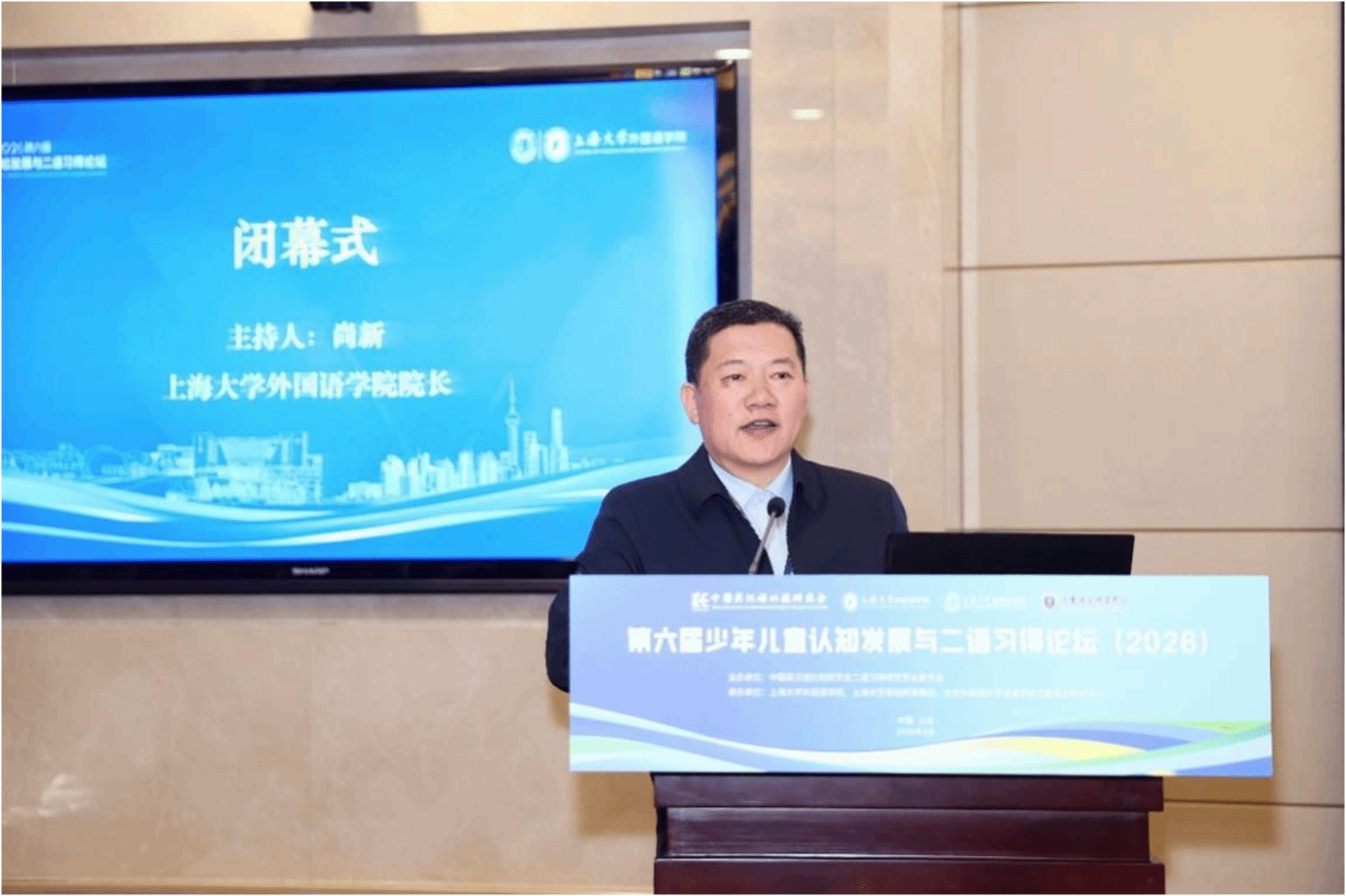 4月19日中午,论坛闭幕式在乐乎新楼学海厅举行,闭幕式由上海大学外国语学院院长尚新教授主持。下一届论坛承办方重庆大学外国语学院代表彭静教授发言,她热情欢迎各位专家学者2027年相聚山城重庆,共同参与“第七届少年儿童认知发展与二语习得论坛”,并介绍了论坛的大致考虑和初步安排。最后,上海大学外国语学院吴蔚书记代表承办单位致感谢辞,她对专家和参会学者表示衷心感谢,表示本次论坛取得圆满成功和专家们高水平的专业报告以及参会学者们的积极参与、无私分享和倾力付出密不可分。她指出,本次论坛聚焦儿童认知发展与二语习得的前沿议题,既有理论高度,又有实践深度,为我国少年儿童外语教育事业的发展注入了新的活力。