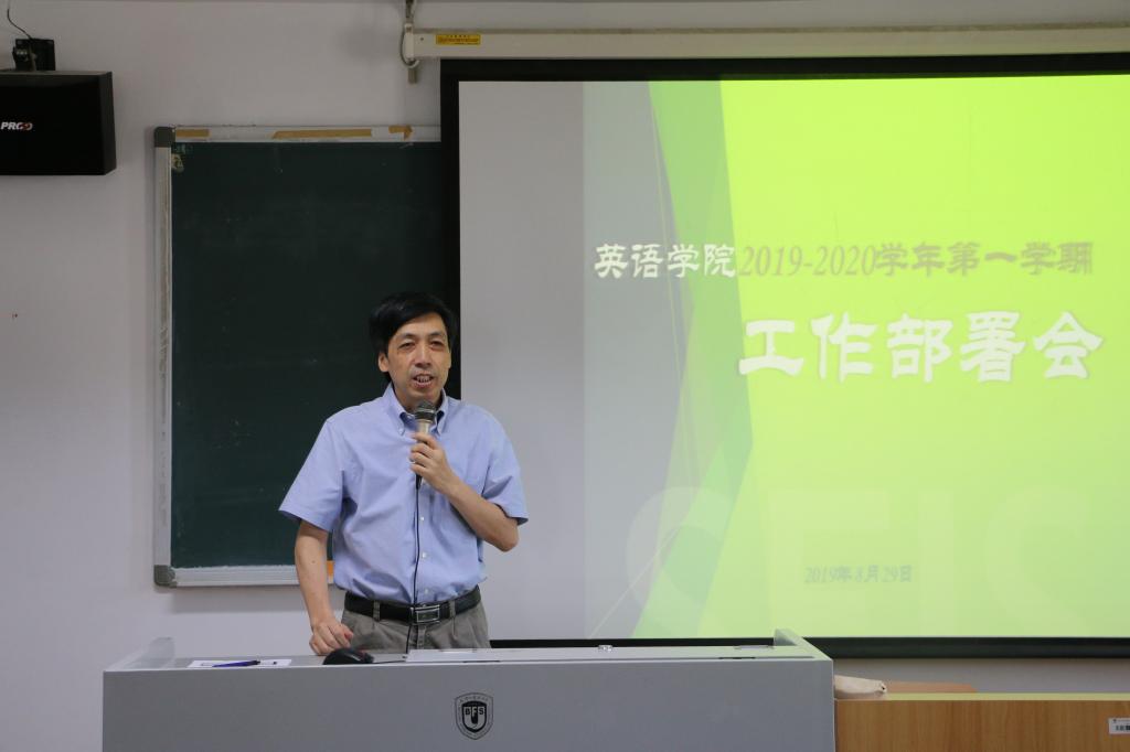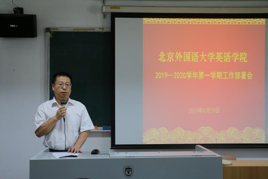 院长张剑对学院本学期各方工作进行部署和安排。张剑院长首先从近两年学院的“奋进之举”项目入手,介绍了“外交外事高级翻译人才培养创新模式探索”、“国别与区域研究智库建设项目”、“南太平洋岛国教材及字典项目”、“学术期刊建设”等四个项目的发展规划。随后,他分别从本科教学、研究生教学、科研工作、国际合作、党建、学生和管理工作、人事工作等方面对学院本学期工作进行了全面部署。本科教学方面,在做好常规教学工作的基础上,本学期还将对2016版本科《培养方案》进行评估研究;继续校级教改重大培育项目;对基础段技能课进行课例研究与分享;关注在线视频公开课及慕课建设等。研究生教学方面,本学期将严格执行校研究生管理相关规定;探索翻译专业博士学位点建设可行性;完善各类招生录取工作机制;推进MTI师资及课程建设等。科研工作方面,学院鼓励全院教师积极申报科研项目,如国家社科基金重大项目、国家级、省部级高层次科研项目、“中青年卓越人才支持计划”等;各研究中心也将组织召开多次重要会议;此外,本学期也将迎来“双一流”学科建设中期检查。国际合作方面,将继续本年度的外专引进工作,学生交换工作及与国外各高校的沟通交流;张剑院长表示,我院应与国外高校扩大交流、深化合作,建立学院间、学者间的密切联系。学生及管理工作方面,除做好常规迎新、就业、党团、安稳、统战、工会、校友及离退休工作外,今年将开展庆祝新中国成立70周年系列活动及“不忘初心,牢记使命”主题教育活动等,也将推进教师集中理论学习活动,进一步加强师德师风建设。人事工作方面,会上对本学期人事变化进行了简要说明。会前还根据学校党委工作部署安排,与会教职工还结合王展鹏副院长和谢韬副院长2018—2019学年的述职述廉报告,对两位副院长过去一学年的工作做了测评。