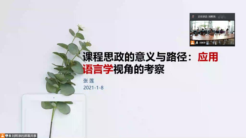 张莲副院长以“课程思政的意义与路径”为主题做了主旨发言,从应用语言学视角对课程思政进行考察分析,与全院教师做了学术分享。她细致讲解了课程思政的意义及课程思政教育的路径,并通过具体案例片段进行说明。