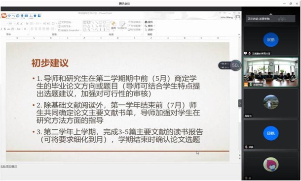 主管本科教学工作的副院长张莲就“2016版本科培养方案实证评估”做了主旨发言,从三方面与老师们分享了具体的评估内容和结果、结论与启示。老师们对2016版培养方案的成效有了更深的理解,这也对今年秋季使用2020版本科培养方案有所帮助。主管研究生教学工作的副院长王展鹏从研究生毕业论文撰写、导师制现有规定及细化研究生指导建议等方面进行了着重说明,力求进一步完善研究生教学管理,提高研究生培养质量。