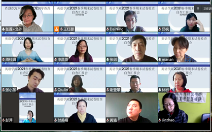 于2021年3月18日召开2020-2021学年秋季学期期末考试试卷自查汇报线上会议。院长张剑、副院长张莲、彭萍、英语系副主任张小东,以及本科各教研室主任、方向负责人及课型组长、教务秘书参加了此次会议。
