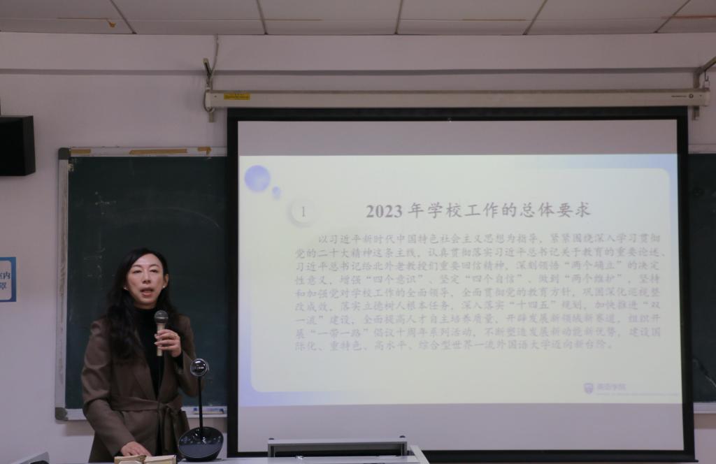 实际,从五个方面提出学院党建工作的重点和目标。一是要突出政治建设,不断强化思想引领。把学习贯彻党的二十大精神与学习贯彻习近平总书记给北外老教授重要回信精神结合起来,推进党的二十大精神进课堂进头脑,培养更多“三有”人才。二是要突出制度建设,严格落实主体责任。持续推动学院科学决策,全面筑牢意识形态“防火墙”。三是要强化党组织自身建设,继续推进教师党员队伍建设,对标对标创先争优。四是要落实立德树人根本要求,构建协同育人格局及五大育人体系。五是要推进学院文化建设,培育暖心聚爱的学院文化。