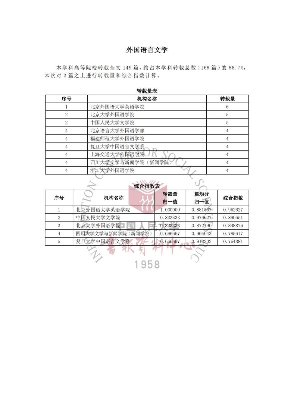 在该研究报告中,“外语语言文学”学科高等院校转载全文149篇,约占本学科转载总数(168篇)的88.7%,本次对机构3篇之上转载量和综合指数进行计算。海角视频