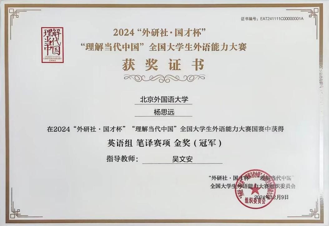 大赛立足翻译实战,将家国情怀、国际视野与翻译能力的培养融于一体,通过话题多元、形式多样的翻译任务,考查选手对不同文体语篇特点的把握和相关翻译策略的灵活运用,鼓励大学生提升人工智能时代与新媒体时代所需的国际传播能力,成为胸怀祖国、业务精湛、融通中外的优秀翻译人才。陈嘉良同学和杨思远同学表现出色,陈嘉良同学获得金奖,杨思远同学则进入总决赛并凭借其坚实的语言基础、广博的知识积累、卓越的应变反应以及敏锐的思辨头脑,最终在总决赛中脱颖而出,荣获冠军的殊荣。