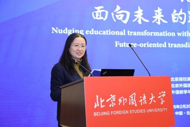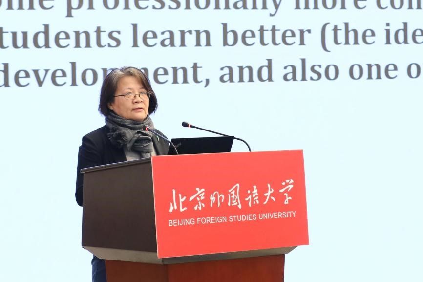 的张莲教授发表了题为“构建外语教师知识基础”的报告。她强调教师的知识发展应根植于社会文化实践,如项目讲座和研究课程。张教授指出,教师的知识基础在多个领域应得到显著提升,这对教师的专业发展至关重要。此外,广东外语外贸大学秦丽莉教授分析了二语习得动态评估中的潜在分数计算公式,呼吁多学科合作以优化评分模型。首都师范大学魏戈副教授则探讨了教育数字化下教师在线集体学习的重要性,提出基于变革实验室的创新解决方案。