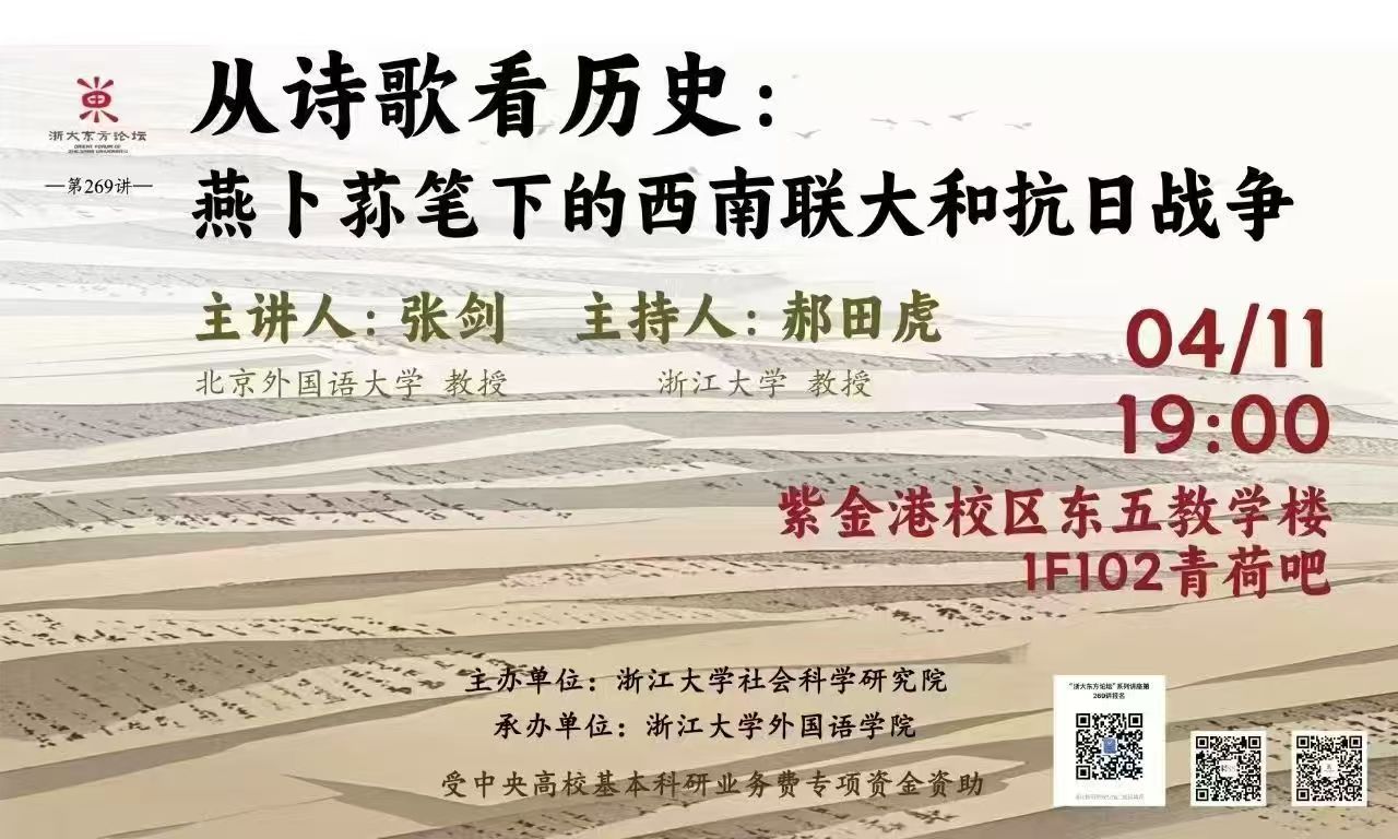 张剑教授受浙江大学外国语学院邀请在“浙大东方论坛”做主讲嘉宾。讲座主题为“从诗歌看历史:燕卜荪笔下的西南联大和抗日战争”。