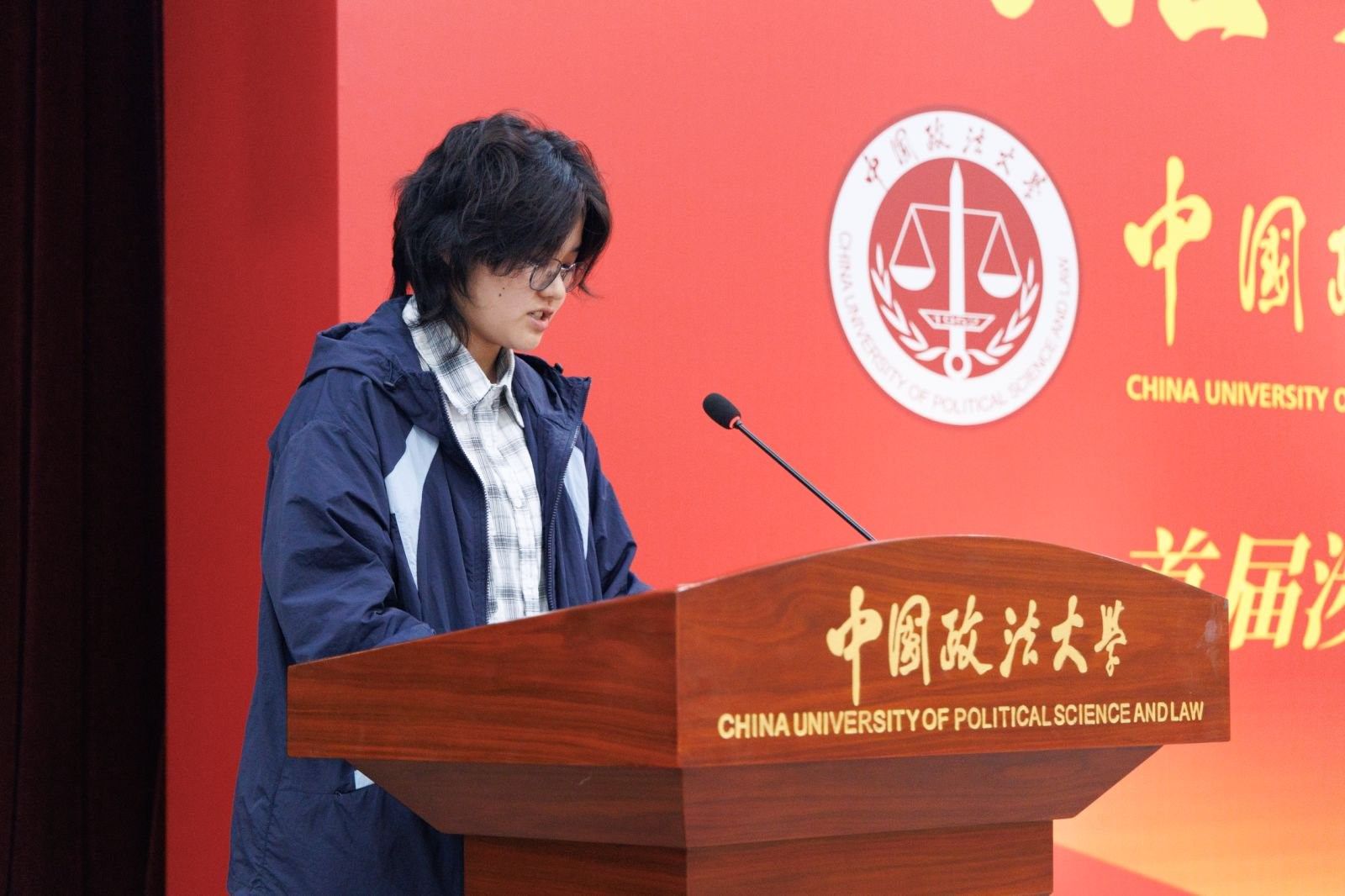 毕业生代表蒋荣在发言中分享了联培班丰富多彩的校园生活。她特别提到:“兼容并蓄,博学笃行”、“厚德明法,格物致公”,两校的校训,最后成为了“语通中外,法治天下”的班训,如车之两轮,鸟之双翼,相辅相成,相伴而生。面对未来,她引用习近平总书记对涉外法治人才培养的重要指示,号召同学们将个人发展与国家命运紧密相连,以扎实的专业能力、开阔的国际视野和强烈的家国情怀,为构建人类命运共同体贡献青春力量,为世界文明的交流与融合增添一抹亮色。