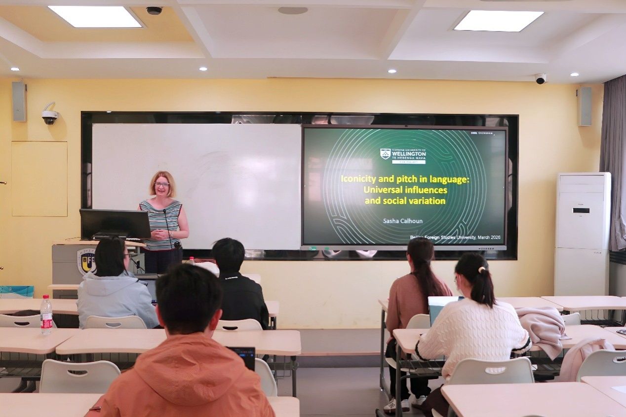 在互动交流环节,围绕“日语中音高差异的象征意义与跨语言对比”、“音高象征关联的量化分析方法”、“研究结论在二语习得中的应用路径”等问题,在场师生积极提问。Calhoun结合日语声调系统特征、实验设计细节及二语语音教学实践案例逐一解答,现场讨论氛围热烈。本次讲座不仅展现了严谨的实验语言学研究范式,更让师生们直观感受到超音段特征背后的社会文化逻辑,为英语语言教育、认知语言学等领域的研究与实践提供了全新视角。