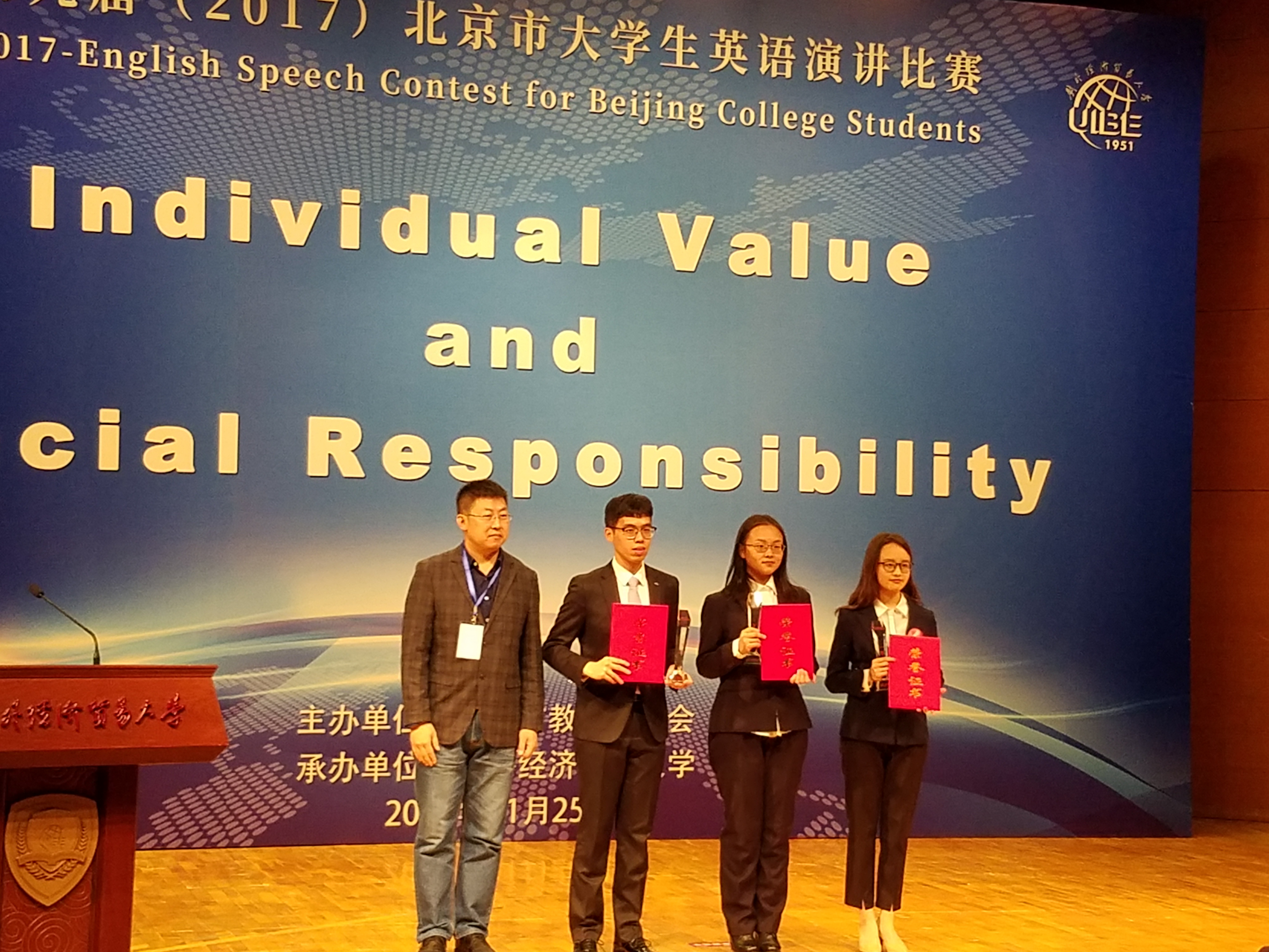 ——11月25日,第九届北京市大学生英语演讲比赛决赛在对外经济贸易大学图书馆报告厅举行。英语学院2016级学生范柳依表现优异,在下午的决赛中以总分第二名获得大赛一等奖。