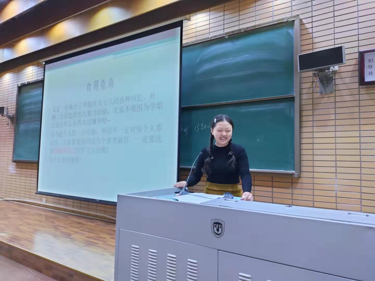 2015级本科生,在2019年英语专八考试取得优秀的成绩。她介绍了英语专八考试的五大题型和收卷模式,提醒大家在考试时注意把握时间,平时要参照正式考试的时间安排多进行模拟。寒假期间并针对自己的弱项进行复习,如词汇量、阅读速度、改错、作文等。