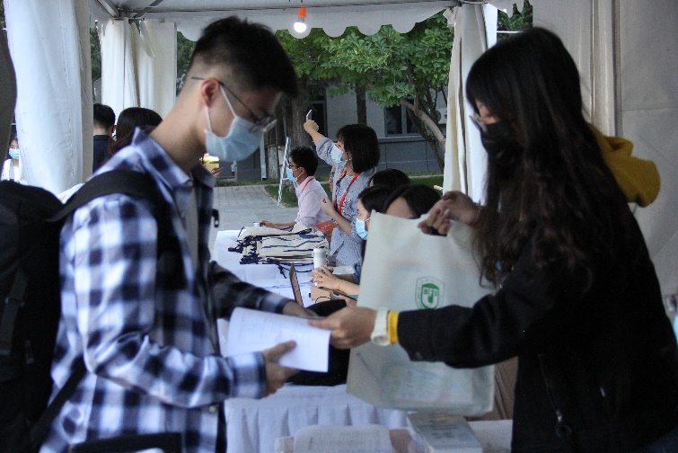 在主楼迎新处,新生们在志愿者的引导下进行了迎新注册码的验证工作,领取北外专属一卡通及新生大礼包。在海角视频