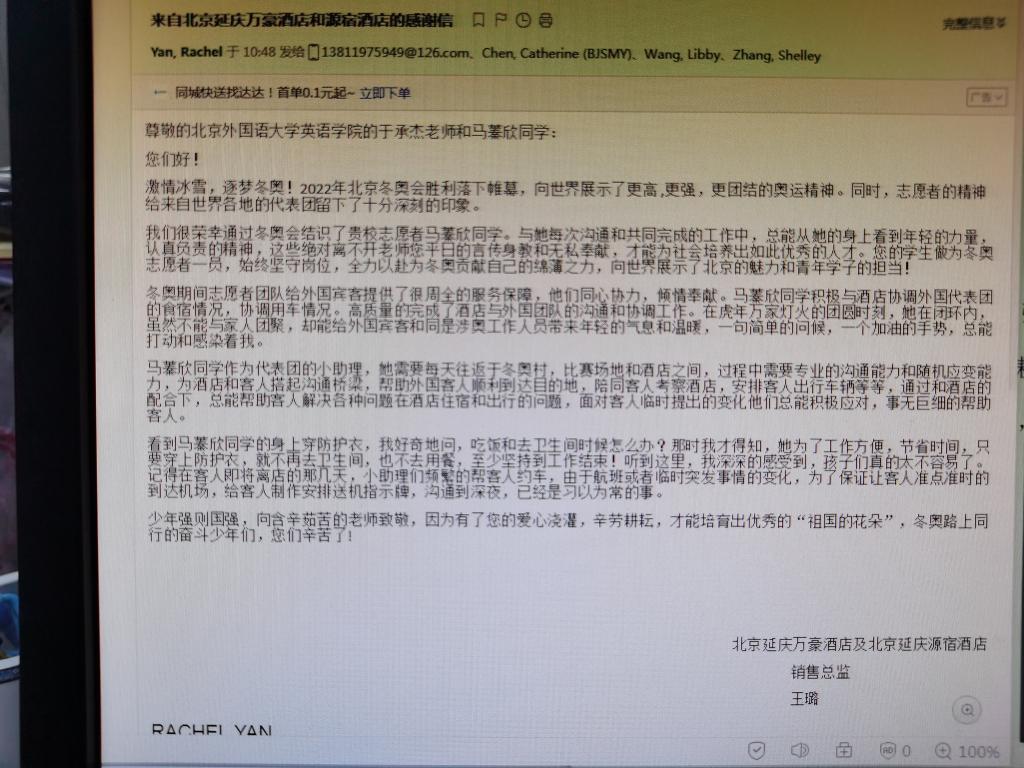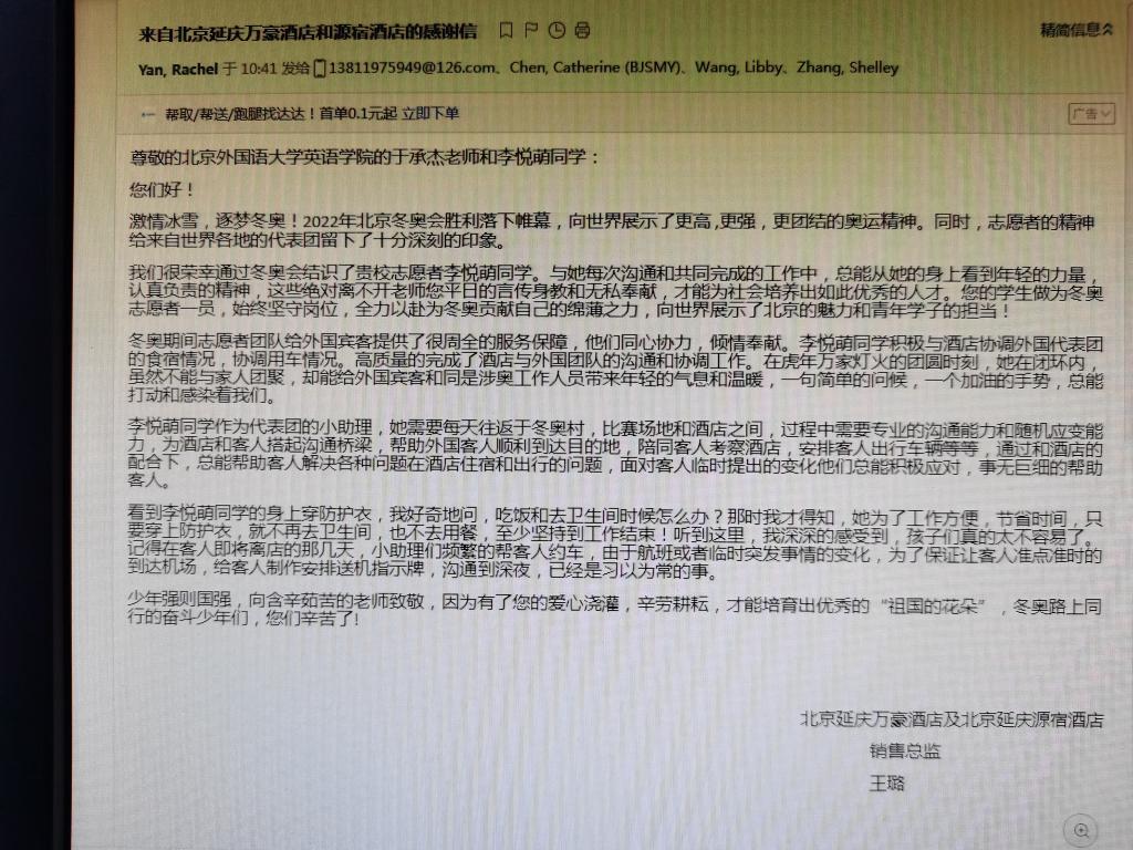 发来感谢信。对我院2019级本科生李悦萌、马蓁欣同学表示感谢,对我校冬奥志愿者在服务期间的工作表现给予高度评价。