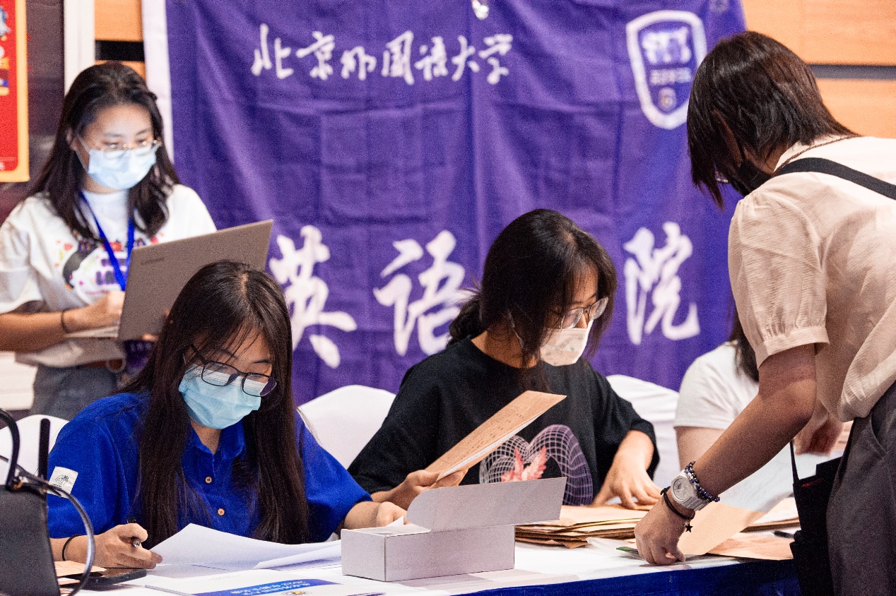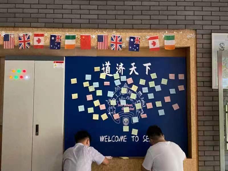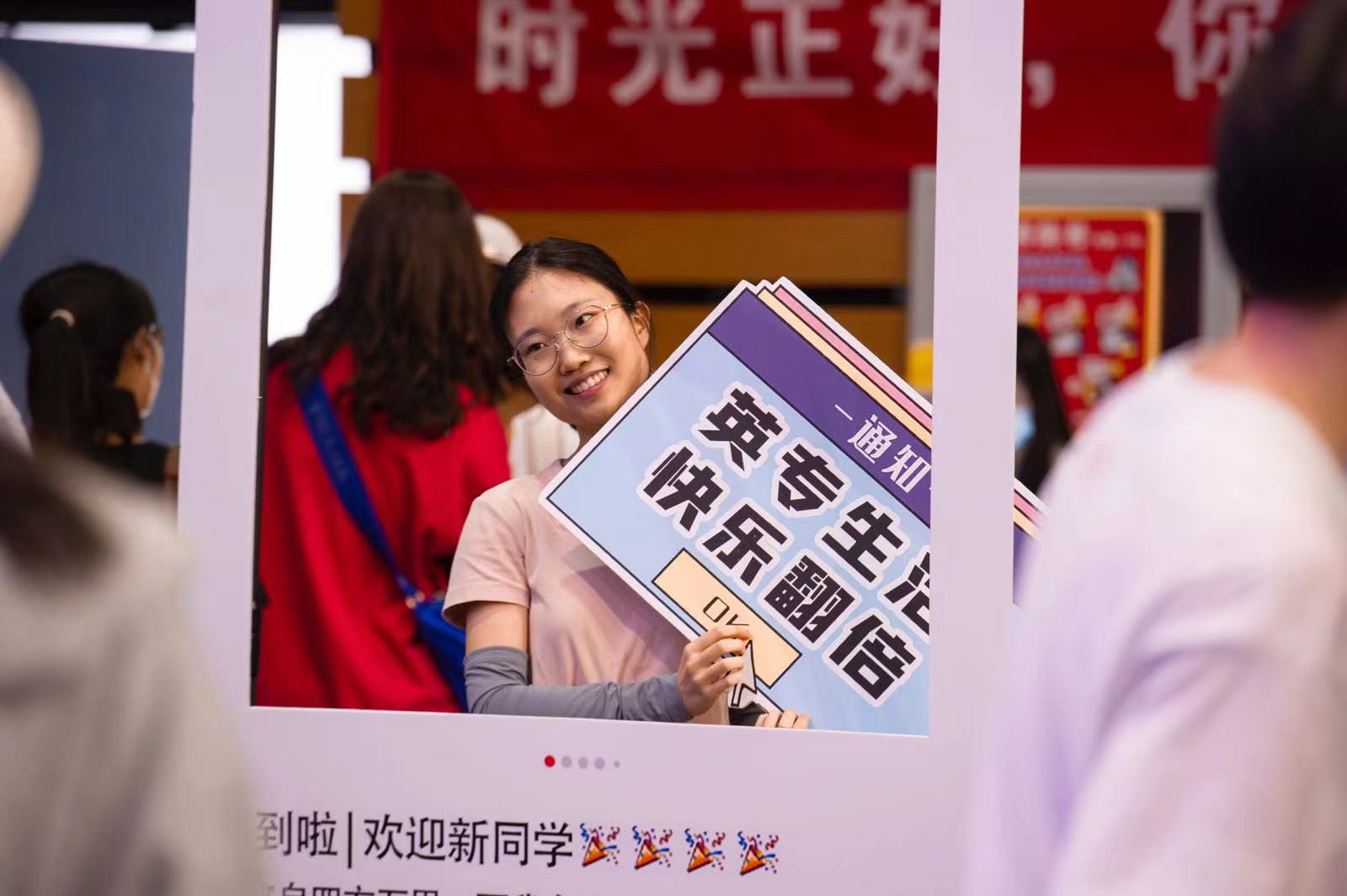 还为新生们准备了迎新大礼包,其中包含英院新生专属的可爱院衫,精致卡套,新生指南,校园地图等精美礼品。志愿者在现场也积极引导新生与拍照板合影留念。学院门口设立印有“知周中外,道济天下”的签名墙和留言墙,新生们在此写下对未来大学生活的期许与展望!