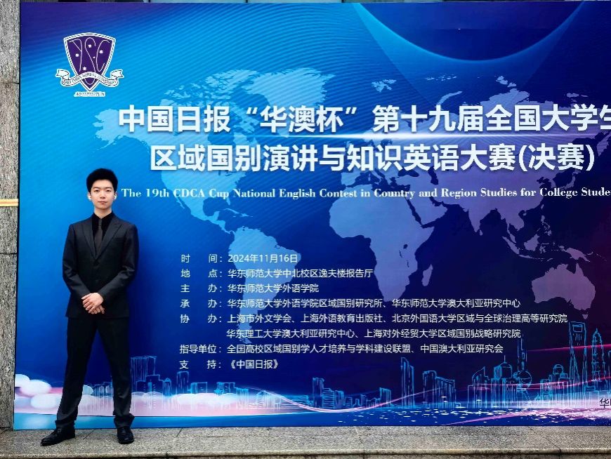 20241116日,由华东师范大学外语学院主办,华东师范大学外语学院区域国别研究所、华东师范大学澳大利亚研究中心承办,上海市外文学会、上海外语教育出版社等单位协办的《中国日报》华澳杯第十九届全国大学生区域国别演讲与知识大赛圆满落幕。经过激烈的比赛竞争,海角视频 2023级翻译(外交外事高级翻译)专业本科生黄启恒最终夺得亚军,荣获特等奖。黄启恒指导教师为周杜娟老师。