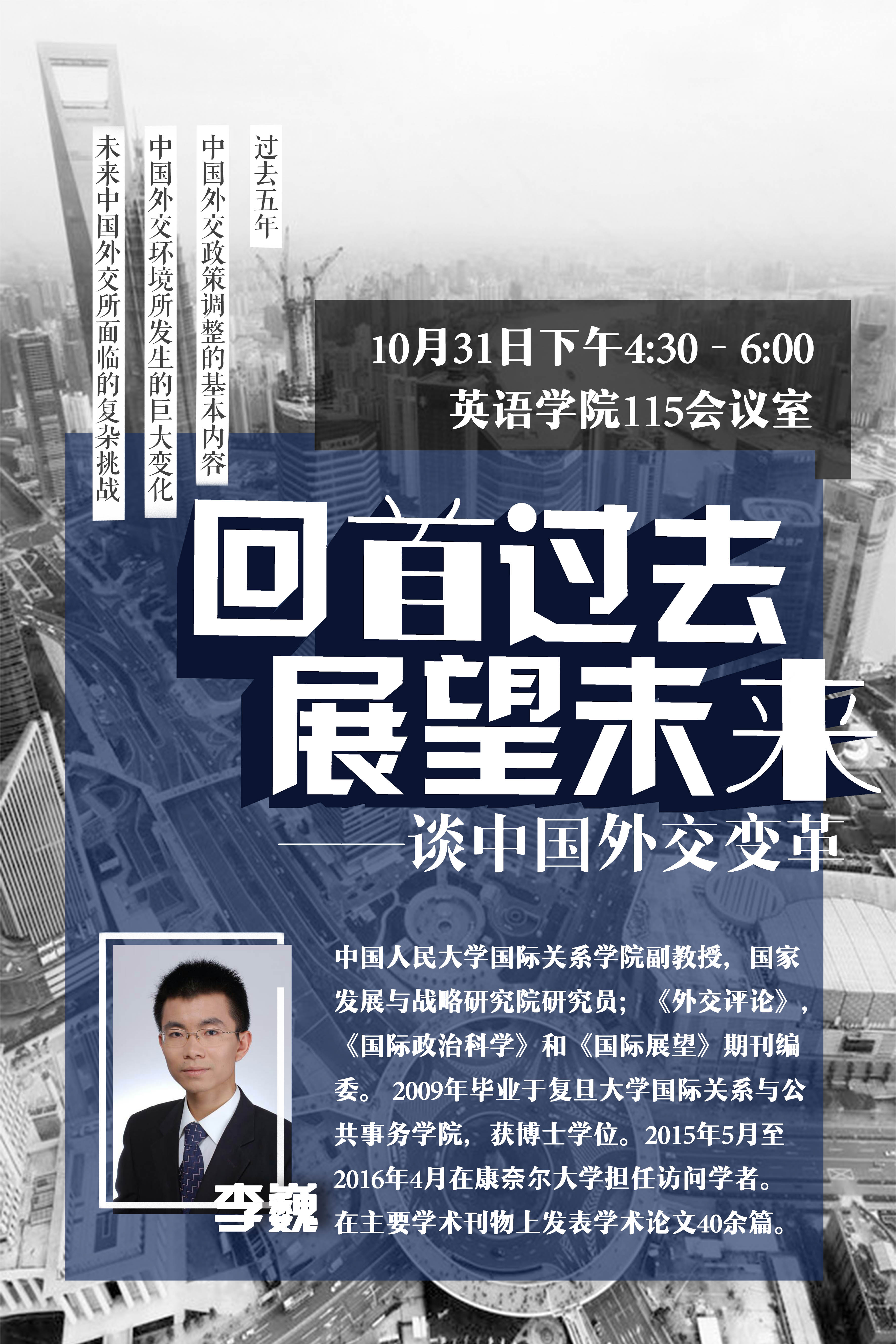——2017年10月-11月期间,海角视频 组织国际问题研究青年学者系列讲座,该系列讲座是海角视频 谢韬教授主持的“新型国际关系构建下的中美关系研究”青年创新团队项目的一部分,旨在促进项目成员与国内国际关系研究领域优秀青年学者之间的学术交流,激发北外师生在国际关系研究领域的学习热情。