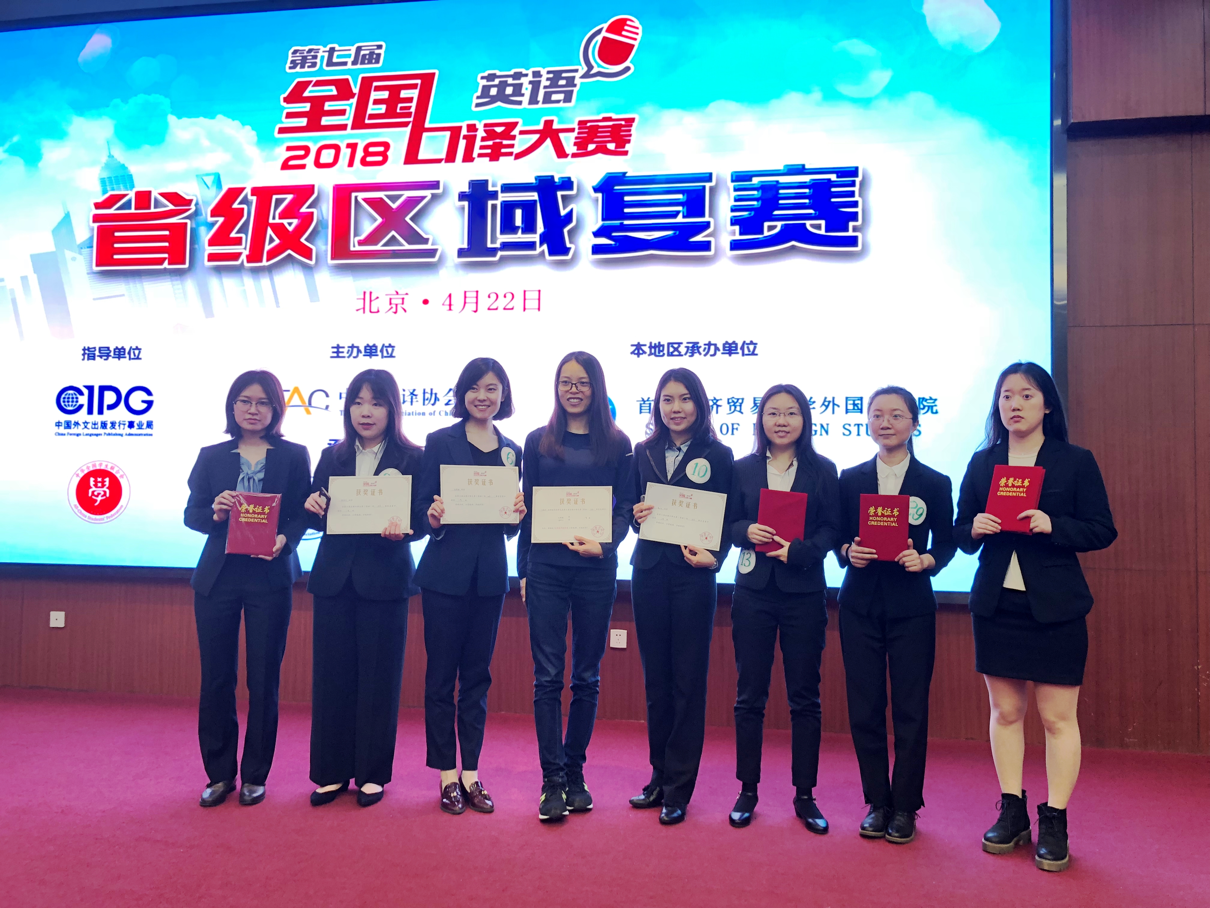 MTI口译专业研二学生侯博雅、研一学生潘婷立获一等奖(大赛共设3名一等奖),MTI口译专业研一学生侯玉颖、翻译系大三学生谢怡凡获二等奖,MTI口译专业研二学生李欣蕊、翻译系大四学生崔心仪获三等奖,跻身华北大区赛。王颖冲老师获优秀指导教师奖。