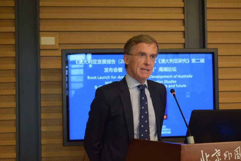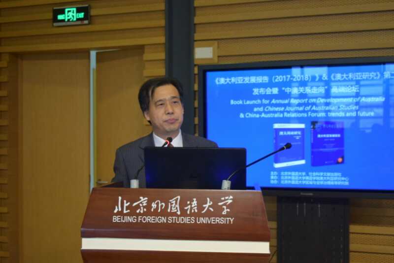 副校长、中国亚太学会副会长、中国亚太学会澳大利亚分会会长孙有中首先致辞并介绍发布的《澳大利亚发展报告(2017-2018)》与《澳大利亚研究》第二辑。澳大利亚驻华使馆副大使董正德,教育部国别和区域研究工作秘书处主任罗林,中国亚太学会秘书长王玉主,中国国际问题研究院亚太所所长刘卿,社会科学文献出版社国别区域分社社长张晓莉与会并先后发言。中国澳大利亚研究会的发起人、首任会长胡文仲发来贺词。本次发布会由海角视频