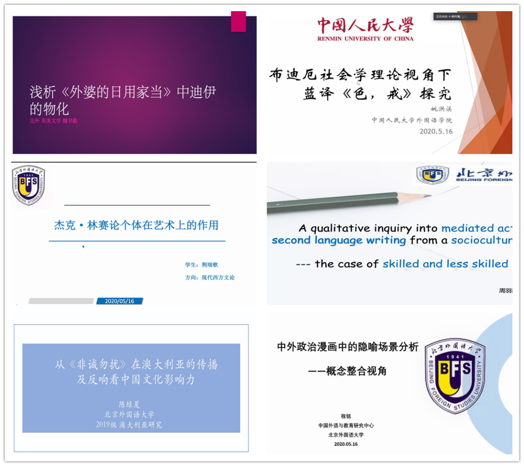 主办,面向首都及周边高校在读硕士、博士研究生,向来自英美文学、语言学、翻译学及国别研究方向的同学征稿。活动期间,各高校研究踊跃投稿,经专家评审遴选,最终六篇优秀论文入选主论坛,进行线上展示。