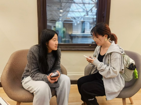 在图书馆内,实践团成员根据各小组分议题分头行动寻找合适的调研对象。其中,一组成员调查中国留学生在澳洲社会的融入情况,通过问卷和采访发现,语言障碍和文化差异是当前中国留学生面临的两大主要挑战,但大多数留学生通过自身努力正试图逐渐融入,对在澳学习和生活情况普遍持正面态度。另一组调查澳洲本地居民对中国文化的了解和接受程度。调查发现,本地民众普遍对中国文化充满好奇和探索欲望,希望通过饮食、旅游等方式深入了解中国文化。