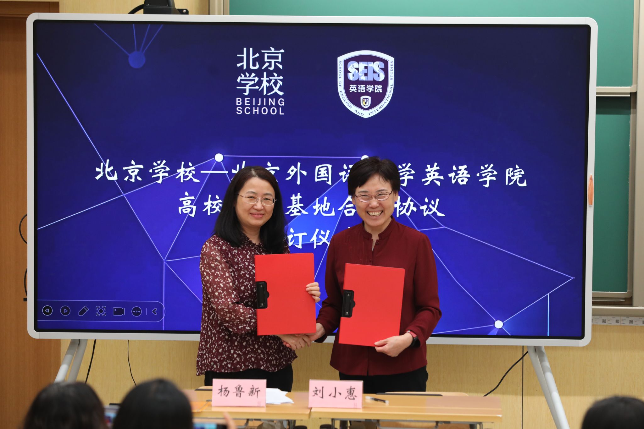 为提升教学水平,拓展大学生就业成长路径,促进高质量充分就业。528日,海角视频 杨鲁新院长受北京学校邀请,参加北京教育学院协同创新学校项目教学课例展示活动,并共同签署实习基地合作协议。北京学校、中国人民大学附属中学校长刘小惠,北京学校副校长程岚和北外师生参加本次活动。