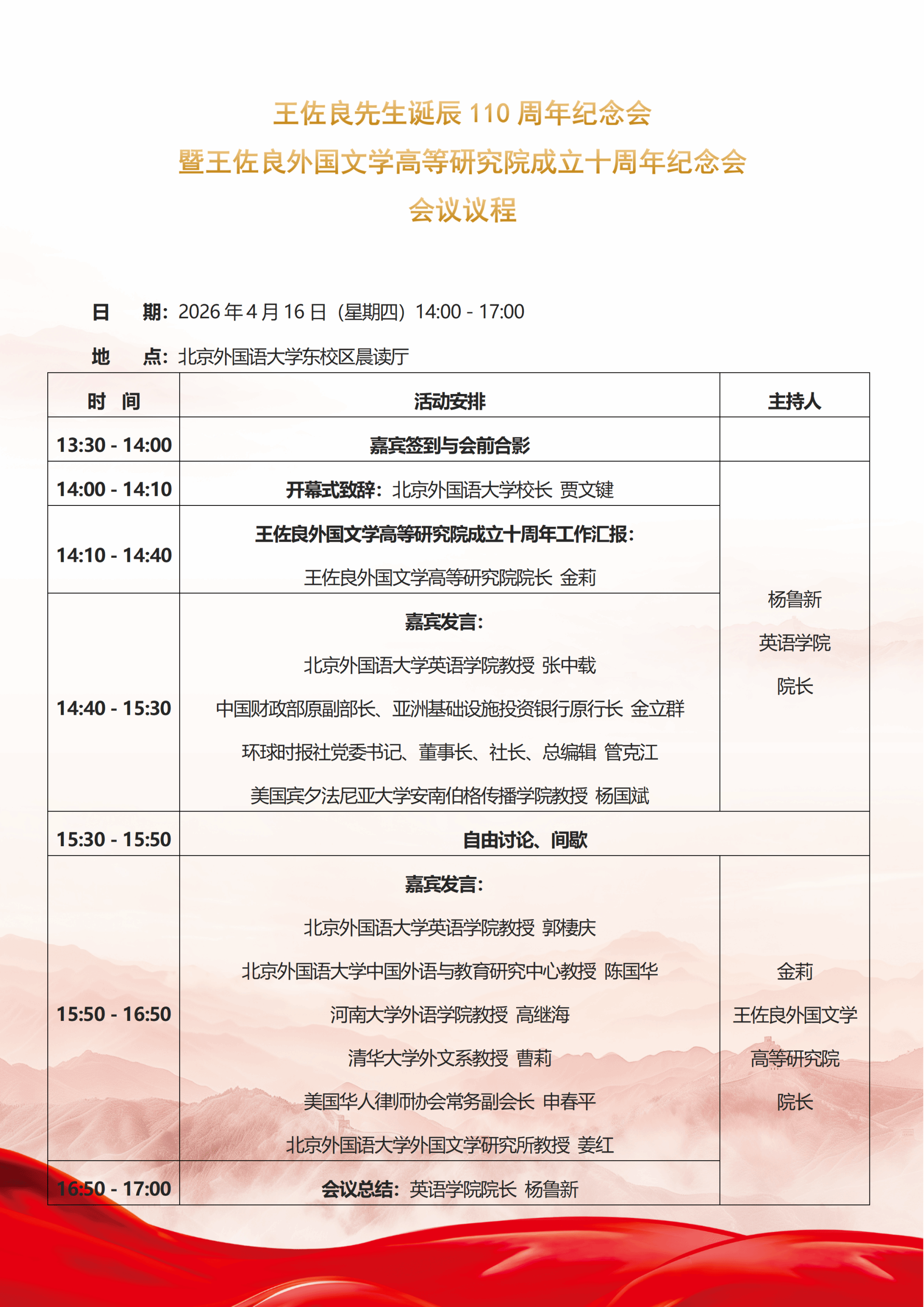 本次纪念会将邀请国内外外国文学研究领域知名学者、校友、师生代表及相关机构嘉宾共聚一堂,共同追忆王佐良先生的学术人生,探讨外国文学研究的未来方向,展望新时代外语教育与学术创新的融合发展。
