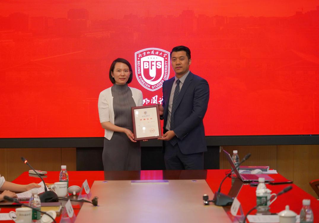 北外英语学院2015级校友、北京风华中傲国际教育创始人兼CEO刘帅,运营总经理刘强,北外孔子学院工作处处长、校友会副会长金利民,英语学院院长张剑,党总支书记殷悦,校友办副主任、教育基金会秘书长姚雪,英语学院党总支副书记孟庆琨出席仪式。捐赠仪式由校友办副主任、教育基金会副秘书长崔文馨主持。