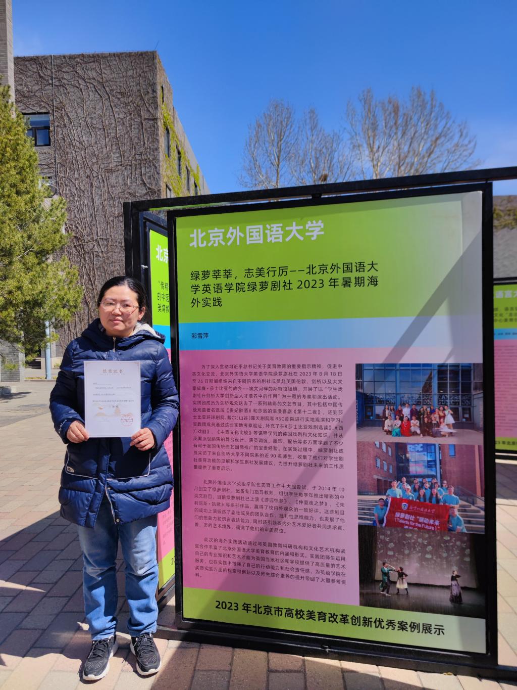 2023年北京市高校美育改革创新优秀案例征集评选活动共征集高校美育案例220余项,有154项案例分获一二三等奖和优秀奖。英语学院邵雪萍博士基于以“学生戏剧社在剑桥大学创新型人才培养中的作用”为主题的考察和演出活动,申报了高校学生艺术社团及实践工作坊建设项目《绿萝莘莘,志美行厉——北京外国语大学英语学院绿萝剧社2023年暑期海外实践》,该项目获得2023年北京市美育改革创新优秀案例三等奖。