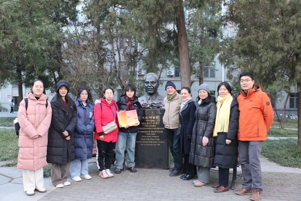 英语学院师生一行前往柯鲁克夫妇雕塑前敬献鲜花,向柯鲁克夫妇及其子女表达感谢,并送上学生们制作的感谢卡片。柯鲁克夫妇毕生致力新中国外语教育事业,传道受业解惑,一生桃李芬芳。1996年,伊莎白·柯鲁克向北京外国语大学教育基金会捐赠,设立柯鲁克夫妇奖学金,连续奖励、资助英语学院学生至今已近30年,激励英语学院上百名优秀学生努力学习、卓越成长,毕业后在不同工作岗位上为国家和社会发展做出了突出贡献。