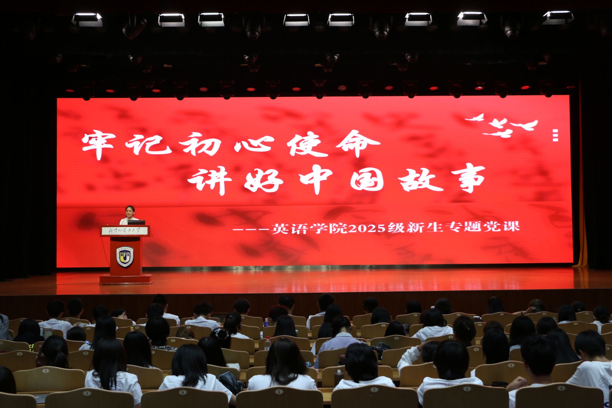 9月5日下午,在英语学院2025级新生开学典礼最后,学院党总支书记殷悦以“牢记初心使命,讲好中国故事”为题,为全体2025级本科生及研究生新生讲授专题党课。