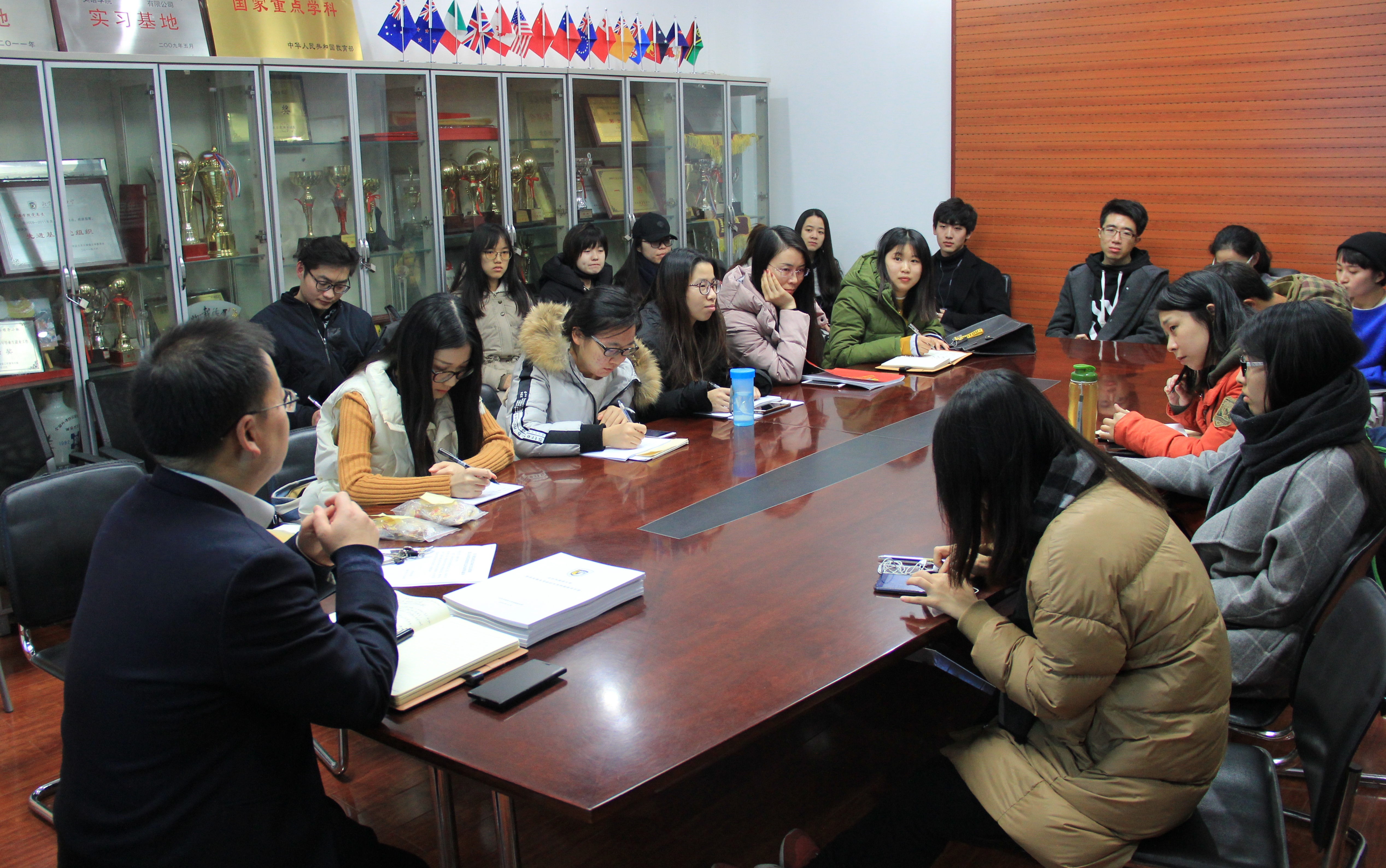 2017年11月21日晚,英语学院党总支召开学生党支部书记、副书记及支部委员会议,布置落实党建评估等相关工作。党总支书记路兴和辅导员于承杰参加会议。