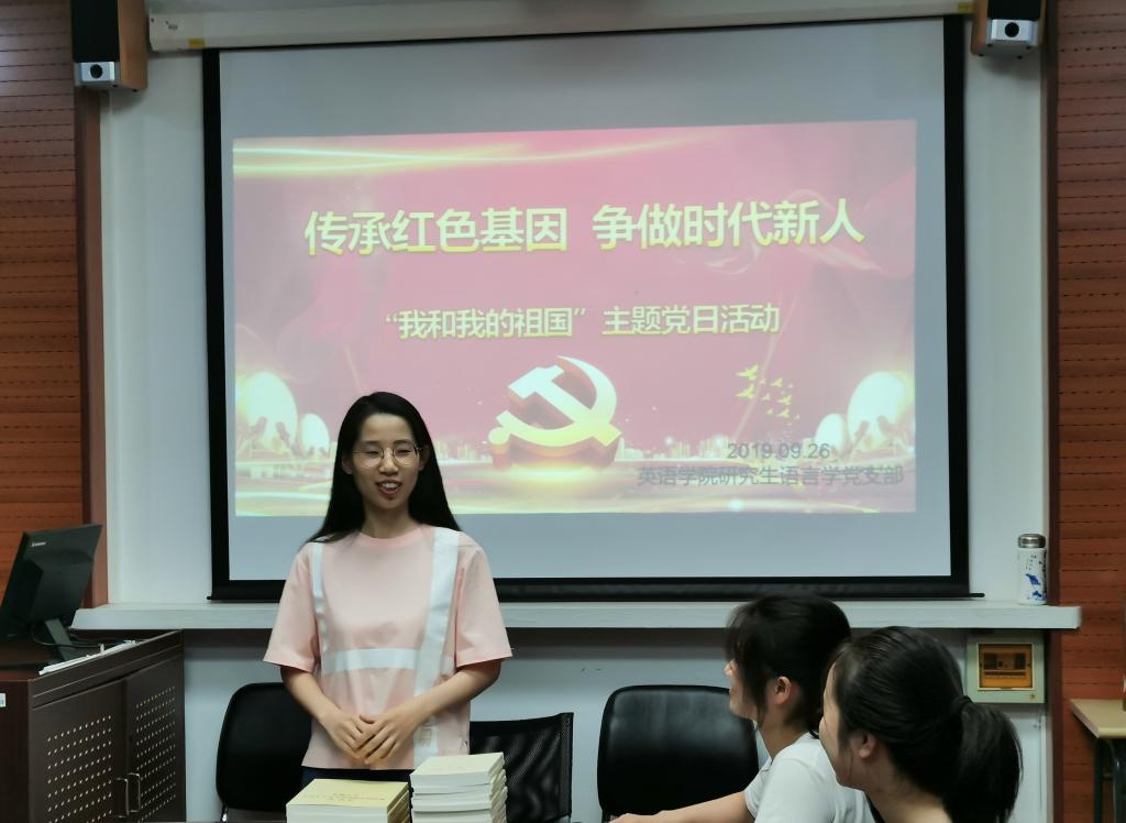 2019年9月26日,为充分落实“不忘初心、牢记使命”主题教育,引领党员们“吃水不忘掘井人”,从红色基因中汲取前进力量,讲好红色故事,英语学院研究生语言学党支部开展“我和我的祖国”主题党日活动。