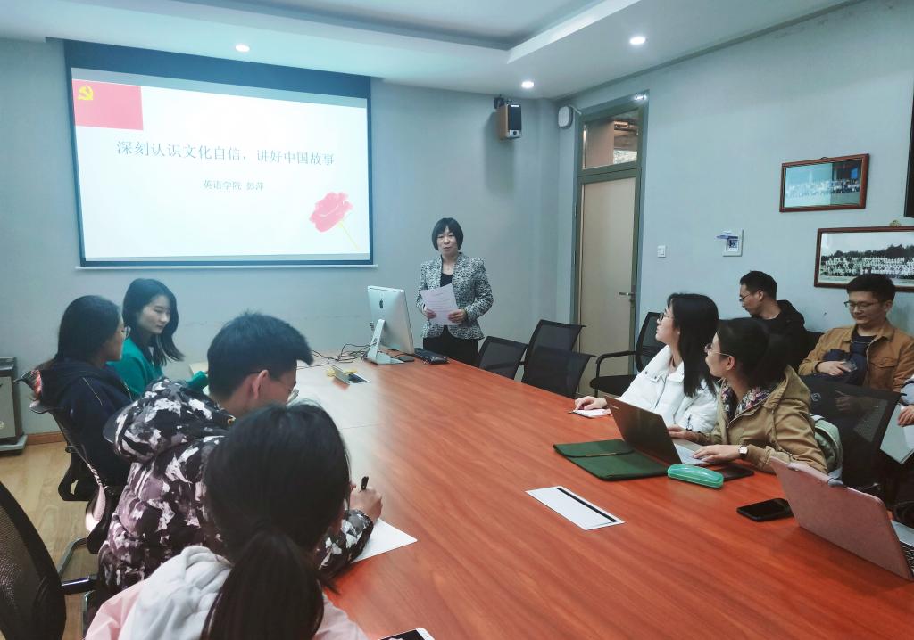 11月1日下午,英语学院副院长彭萍在英语楼111会议室为翻译专业研究生党员和入党积极分子开展“不忘初心,牢记使命”主题教育专题党课活动,党课的题目是“深刻认识文化自信,讲好中国故事”。来自英语学院研究生MTI笔译党支部、研究生MTI口译党支部和研究生翻译学党支部的30余名同学聆听了此次党课。