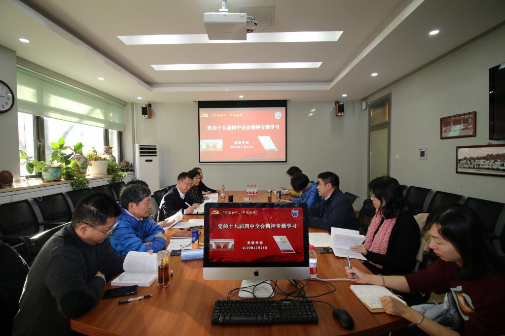 11月14日下午,英语学院理论中心组召开党的十九届四中全会精神专题学习讨论会,交流分享学习党的十九届四中全会精神的认识和体会。学院班子全体成员、党总支委员和教工党支部书记参加学习研讨。会议由党总支书记路兴主持。参会人员会前结合实际研读了学校党委下发的《党的十九届四中全会<决定>学习辅导百问》。