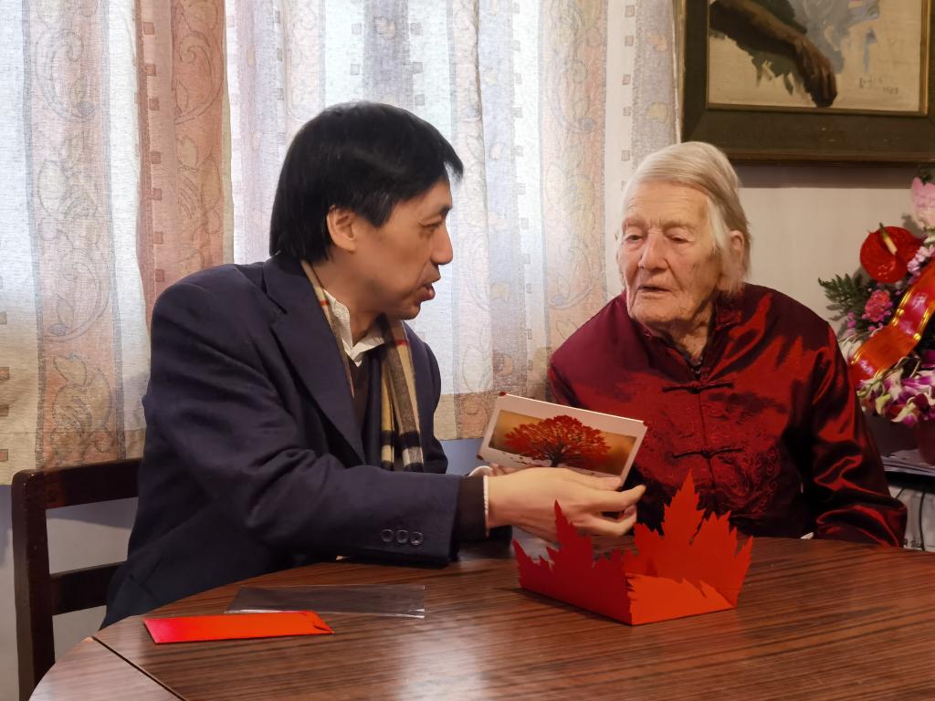 张剑院长为伊莎白教授介绍了英语学院在师资队伍、学科建设、学术研究和人才培养的最新进展和取得的成绩,回顾并感谢伊莎白教授为中国英语教育事业、为英语学院的发展所做出的杰出贡献。路兴介绍了英语学院学生基本情况,重点介绍了柯鲁克夫妇在英语学院所设奖学金评选情况。慰问中,张剑院长还为伊莎白教授敬赠祝福鲜花和学院全体领导班子成员签名的祝福贺卡。