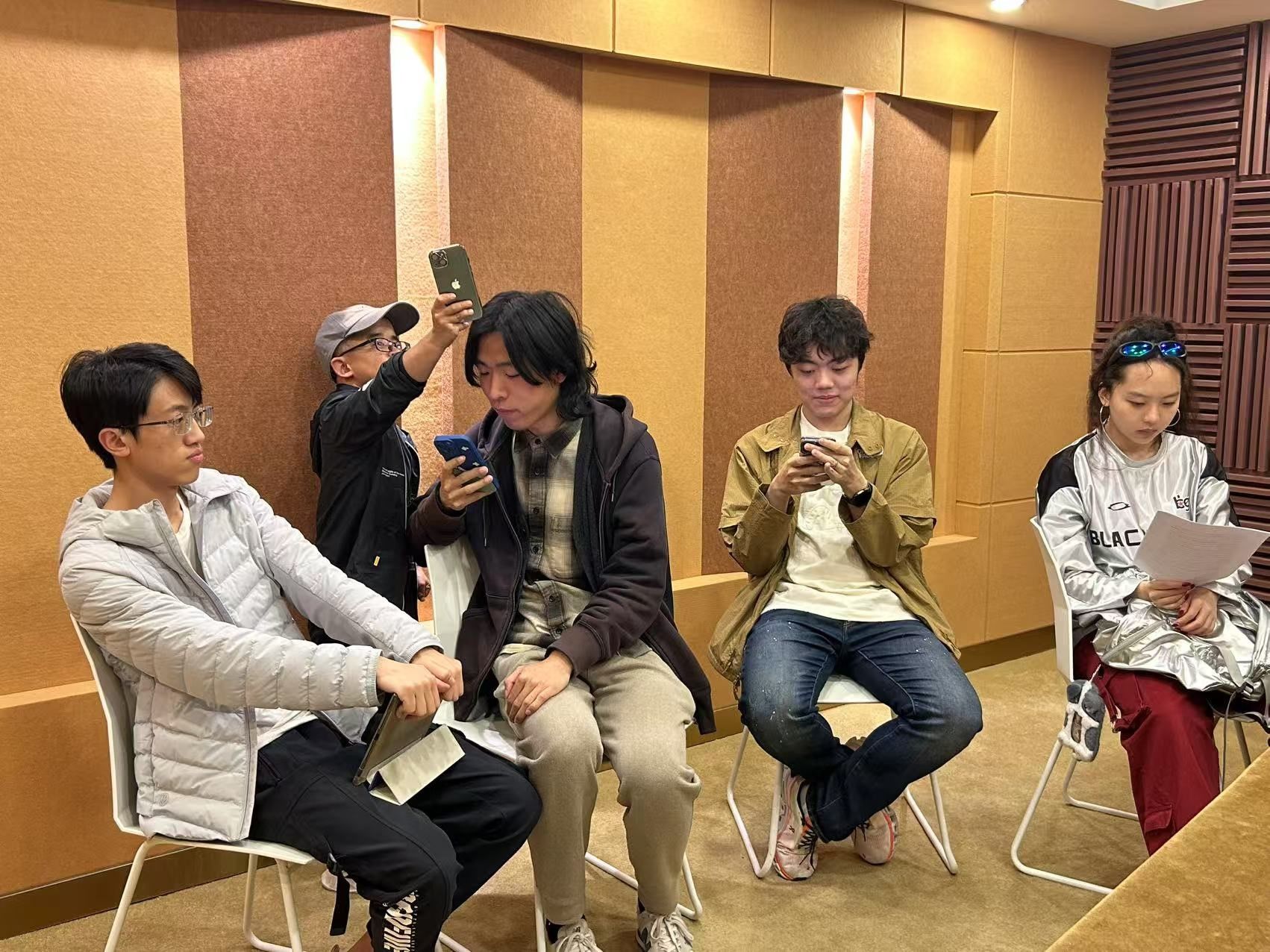 2025年3月25日下午,英语学院文学党支部与北京龙在天皮影艺术剧院在北京外国语大学东院信息技术中心录音室开展共建活动。在皮影剧院孙玉玺老师的指导下,英语学院文学党支部的李钡洱、章心怡、刘凯、仲靖和王轶洲同学共同完成了皮影戏《大闹天宫》的英文版配音。