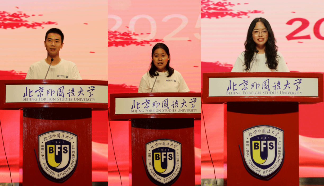 随后,2024级硕士研究生杨世阁同学作为老生代表发言,他与学弟学妹们分享了自己研究生支教团以及大阪世博会志愿者的宝贵经历,希望新生们在学术硬核、发展自由的北外英院大胆勇敢地去经历、去尝试,尽情地探索自己、丰富自己。2025级本科新生代表张梦芊同学则以北外英院的历史底蕴为引,分享了自己的三点愿景:家国之情、求真之心与担当之志。她期待与同学们一起,心怀国家、放眼世界,不断提升自己的专业能力与素养。2025级国际项目新生杨景行同学则认为,同学们不仅要注重“听说读写译”,更要把握不同文明背后的历史脉络、文化内涵与时代精神,也期待同学们在英语学院能够结交良师益友、在实践中将理论知识转化为实际能力。